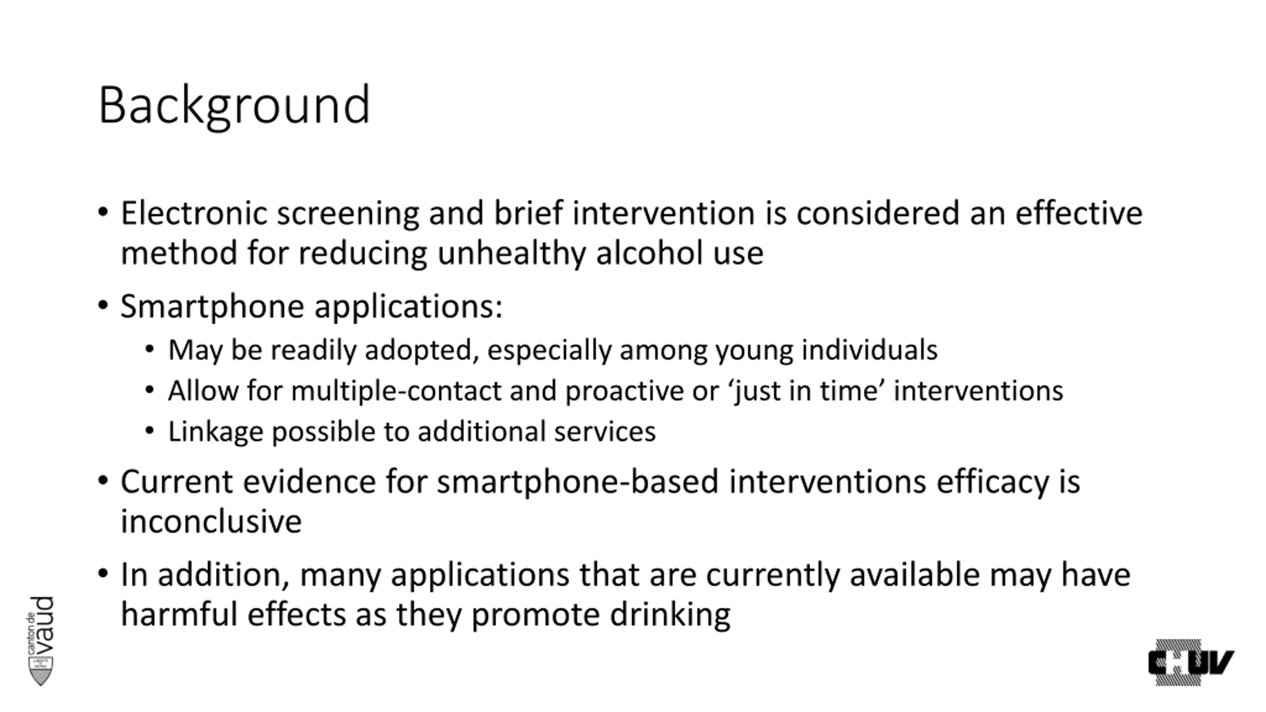 Background Electronic screening and brief intervention is considered an effective method for reducing unhealthy alcohol use Smartphone applications: May be readily adopted, especially among young individuals Allow for multiple-contact and proactive or just in time interventions Linkage possible to additional services Current evidence for smartphone-based interventions efficacy is inconclusive In addition, many applications that are currently available may have harmful effects as they promote drinking