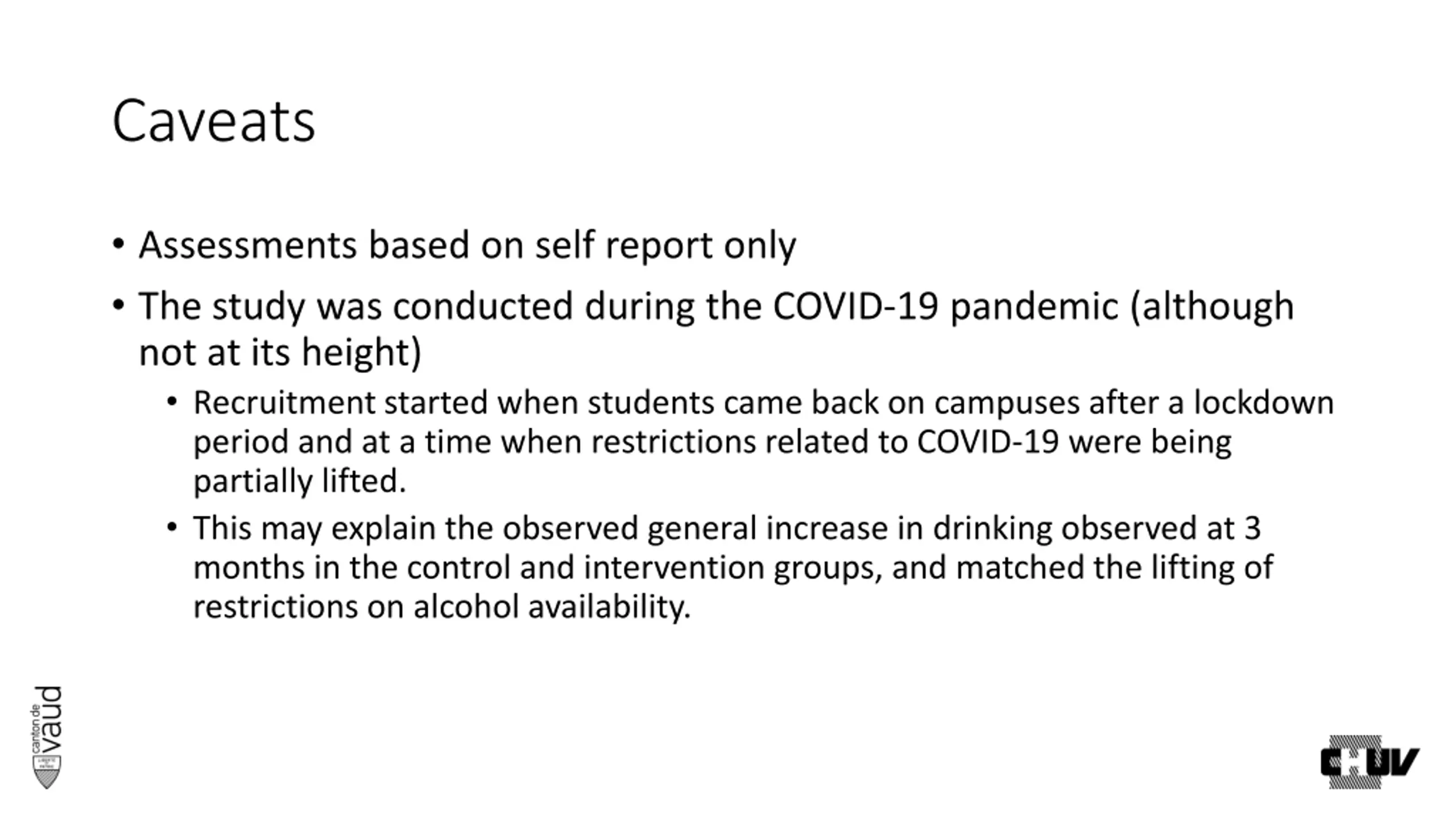 Caveats Assessments based on self report only The study was conducted during the COVID-19 pandemic (although not at its height) Recruitment started when students came back on campuses after a lockdown period and at a time when restrictions related to COVID-19 were being partially lifted. This may explain the observed general increase in drinking observed at 3 months in the control and intervention groups, and matched the lifting of restrictions on alcohol availability.
