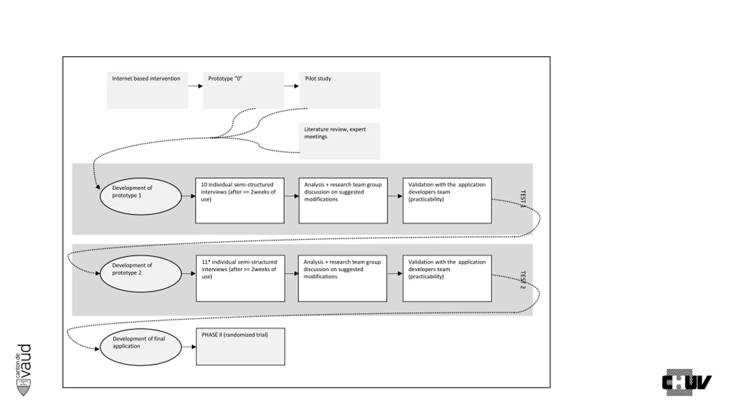 Internet based intervention Prototype 0 Pilot study Literature review, expert meetings 10 individual semi-structured interviews (after >= 2weeks of use) Analysis + research team group discussion on suggested modifications Validation with the application developers team (practicability) Development of prototype 1 TEST 1 11* individual semi-structured interviews (after >= 2weeks of use) Analysis + research team group discussion on suggested modifications Validation with the application developers team (practicability) Development of prototype 2 TEST 2 PHASE II (randomized trial) Development of final application