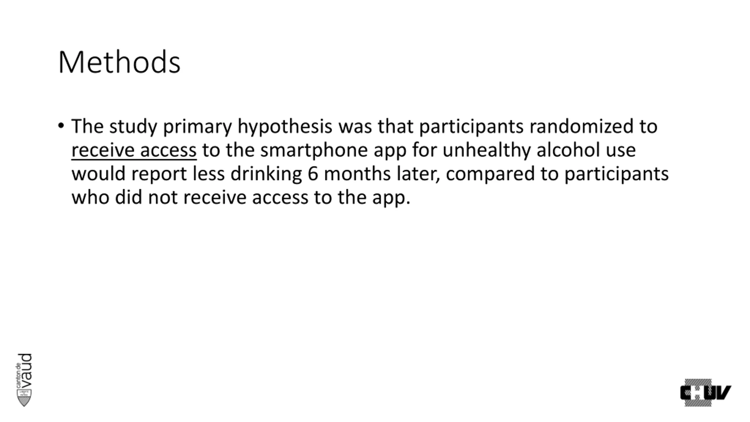 Methods The study primary hypothesis was that participants randomized to receive access to the smartphone app for unhealthy alcohol use would report less drinking 6 months later, compared to participants who did not receive access to the app.