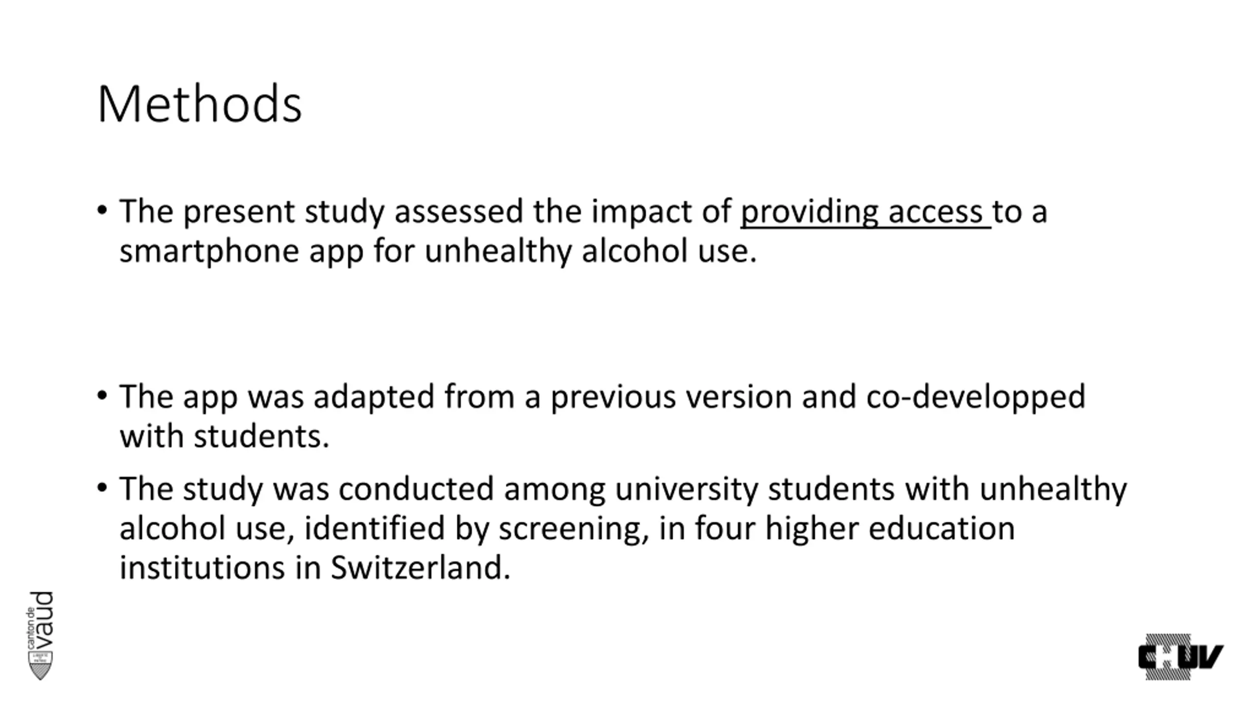 Methods The present study assessed the impact of providing access to a smartphone app for unhealthy alcohol use. The app was adapted from a previous version and co-developped with students. The study was conducted among university students with unhealthy alcohol use, identified by screening, in four higher education institutions in Switzerland.