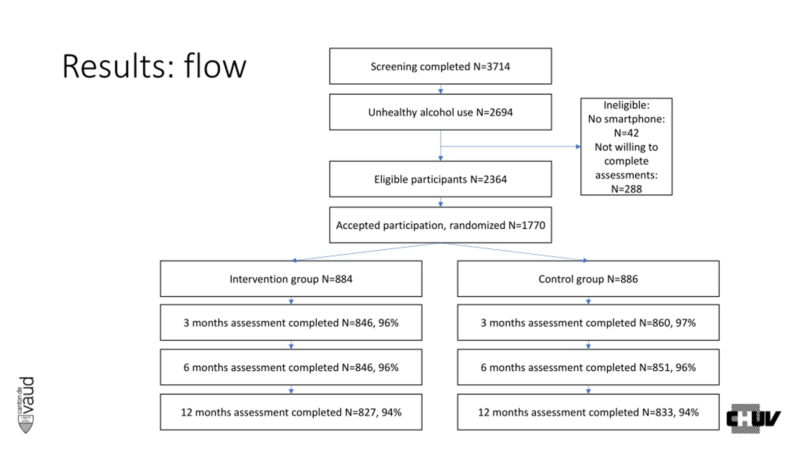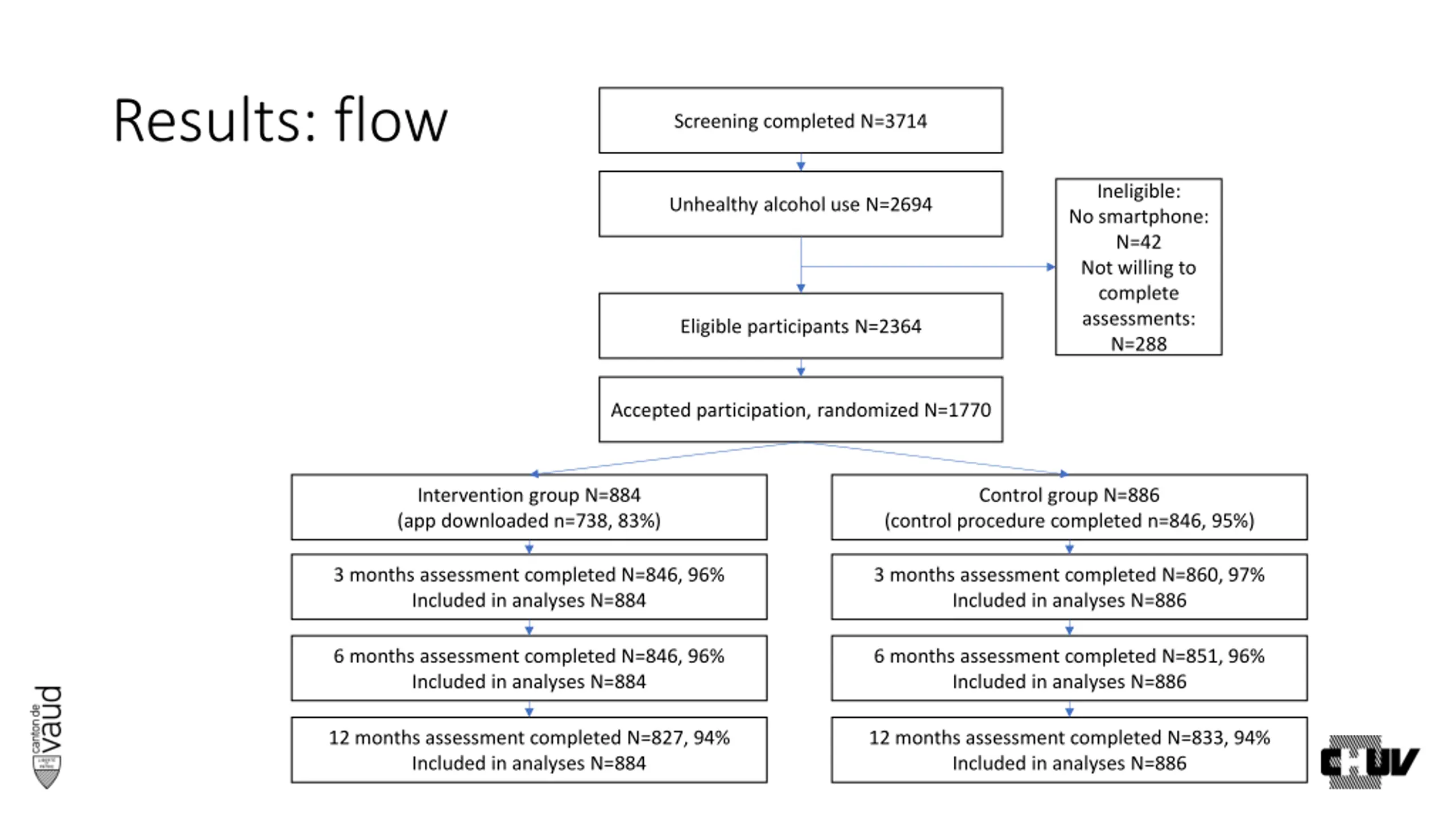 Results: flow Screening completed N=3714 Ineligible: No smartphone: N=42 Not willing to complete assessments: N=288 Unhealthy alcohol use N=2694 Eligible participants N=2364 Accepted participation, randomized N=1770 Intervention group N=884 Control group N=886 3 months assessment completed N=846, 96% 3 months assessment completed N=860, 97% 6 months assessment completed N=846, 96% 6 months assessment completed N=851, 96% 12 months assessment completed N=827, 94% 12 months assessment completed N=833, 94%