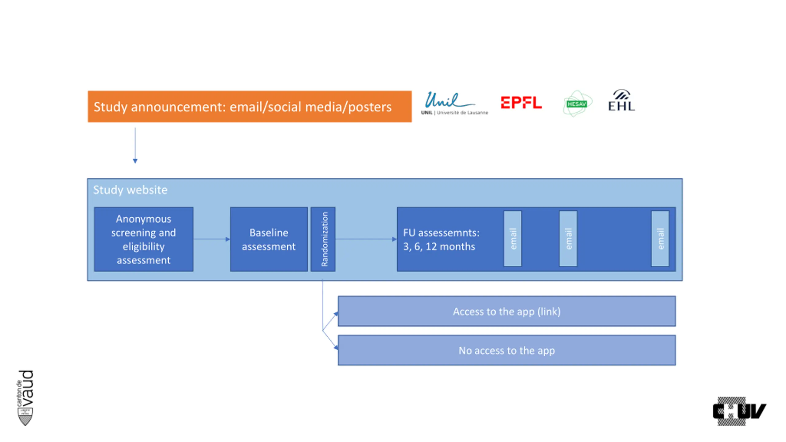 Study announcement: email/social media/posters Study website Randomization Anonymous screening and eligibility assessment Baseline assessment FU assessemnts: 3, 6, 12 months email email email Access to the app (link) No access to the app
