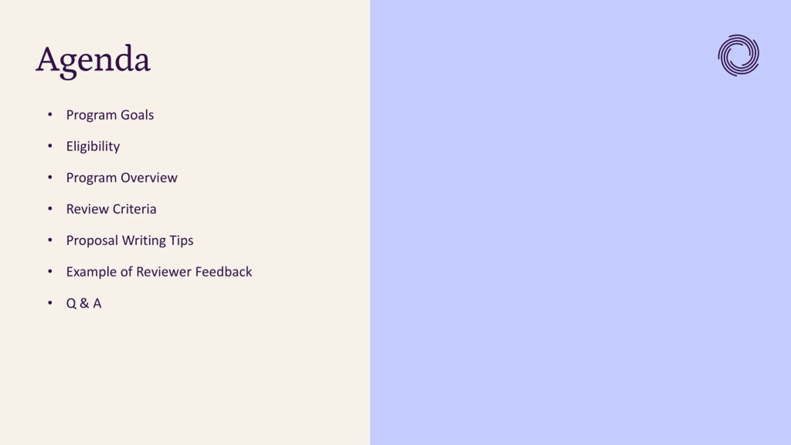 Agenda Program Goals Eligibility Program Overview Review Criteria Proposal Writing Tips Example of Reviewer Feedback Q & A