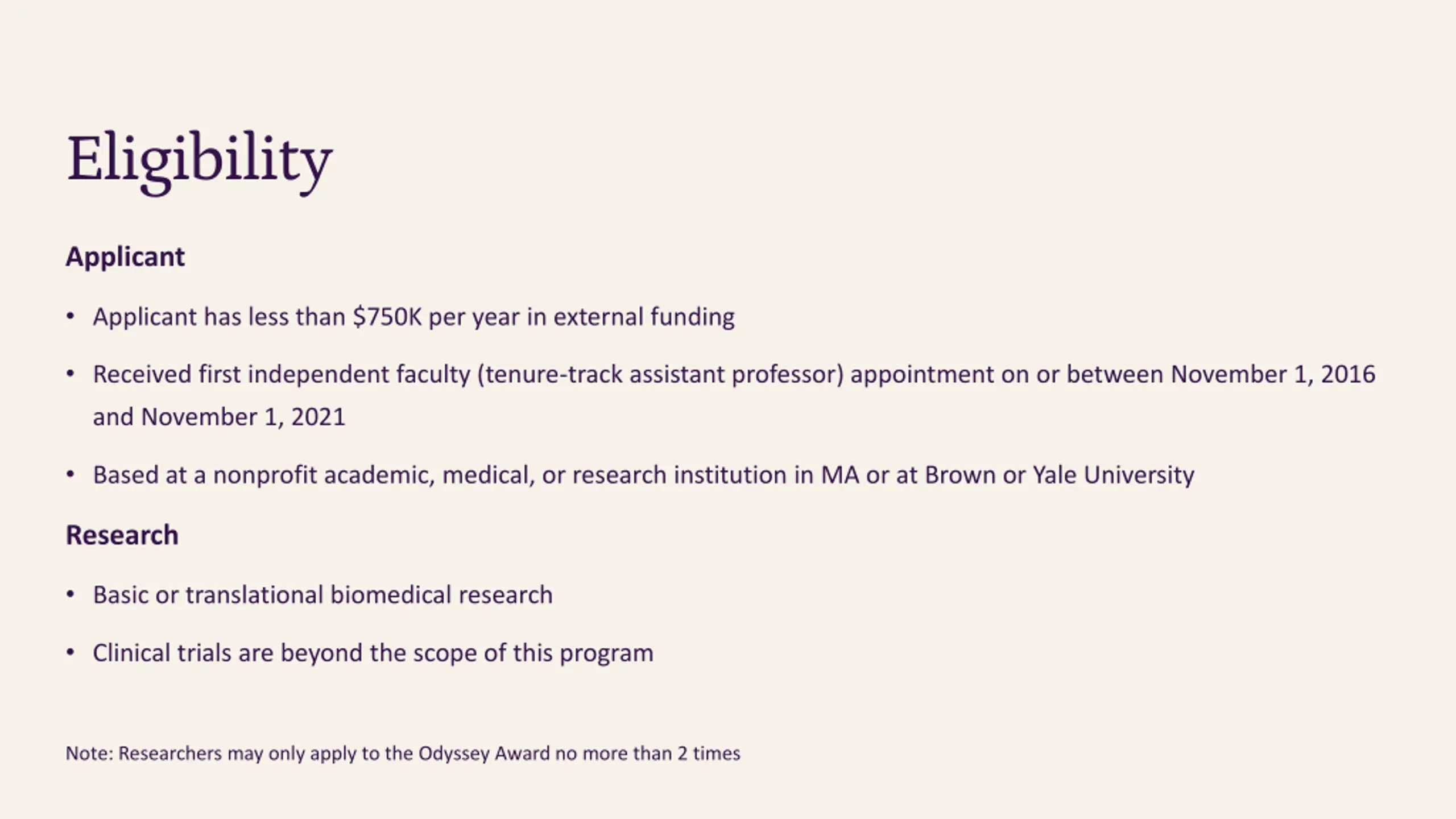 Eligibility Applicant Applicant has less than $750K per year in external funding Received first independent faculty (tenure-track assistant professor) appointment on or between November 1, 2016 and November 1, 2021 Based at a nonprofit academic, medical, or research institution in MA or at Brown or Yale University Research Basic or translational biomedical research Clinical trials are beyond the scope of this program Note: Researchers may only apply to the Odyssey Award no more than 2 times