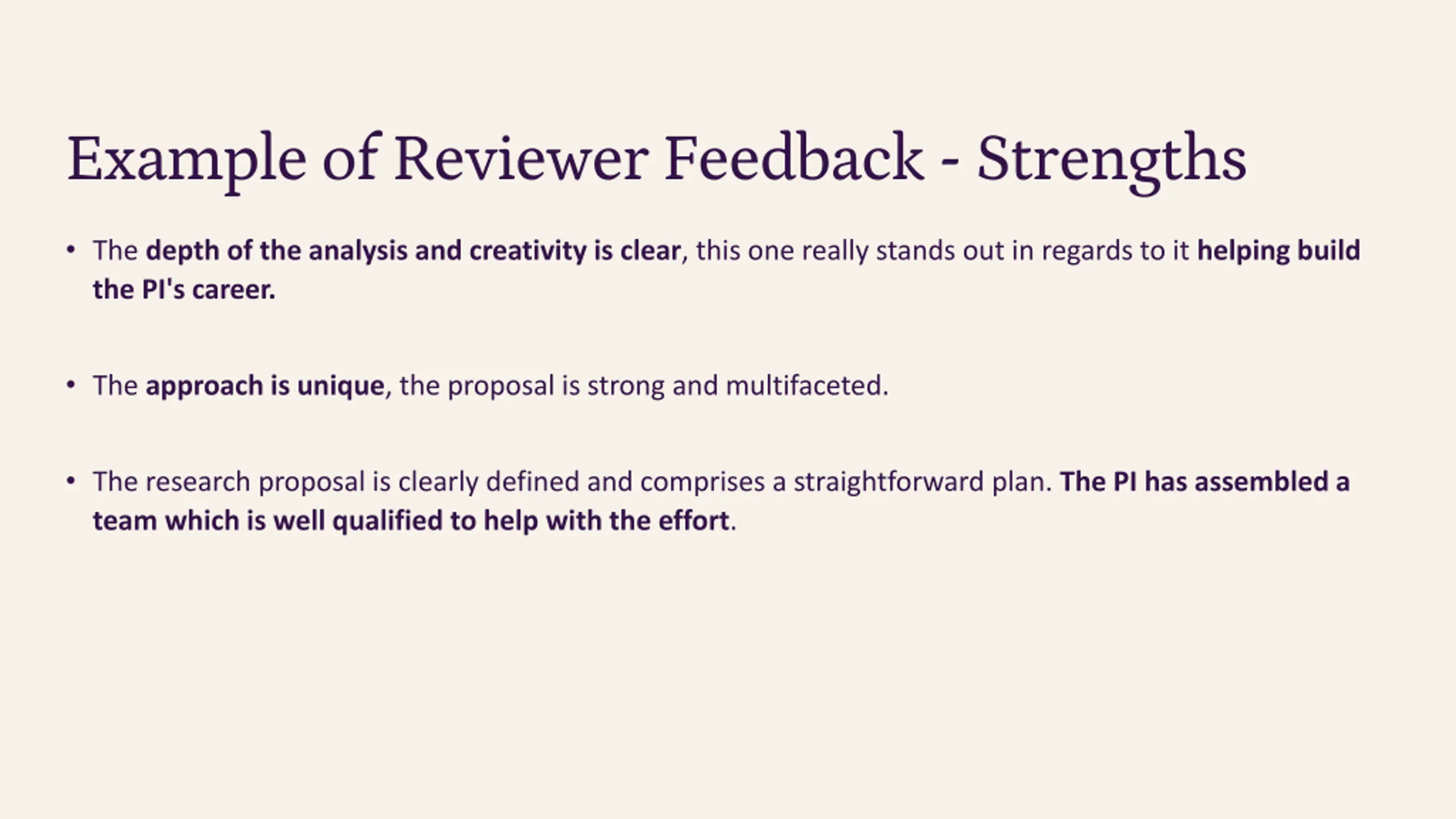Example of Reviewer Feedback - Strengths The depth of the analysis and creativity is clear, this one really stands out in regards to it helping build the PI's career. The approach is unique, the proposal is strong and multifaceted. The research proposal is clearly defined and comprises a straightforward plan. The PI has assembled a team which is well qualified to help with the effort.