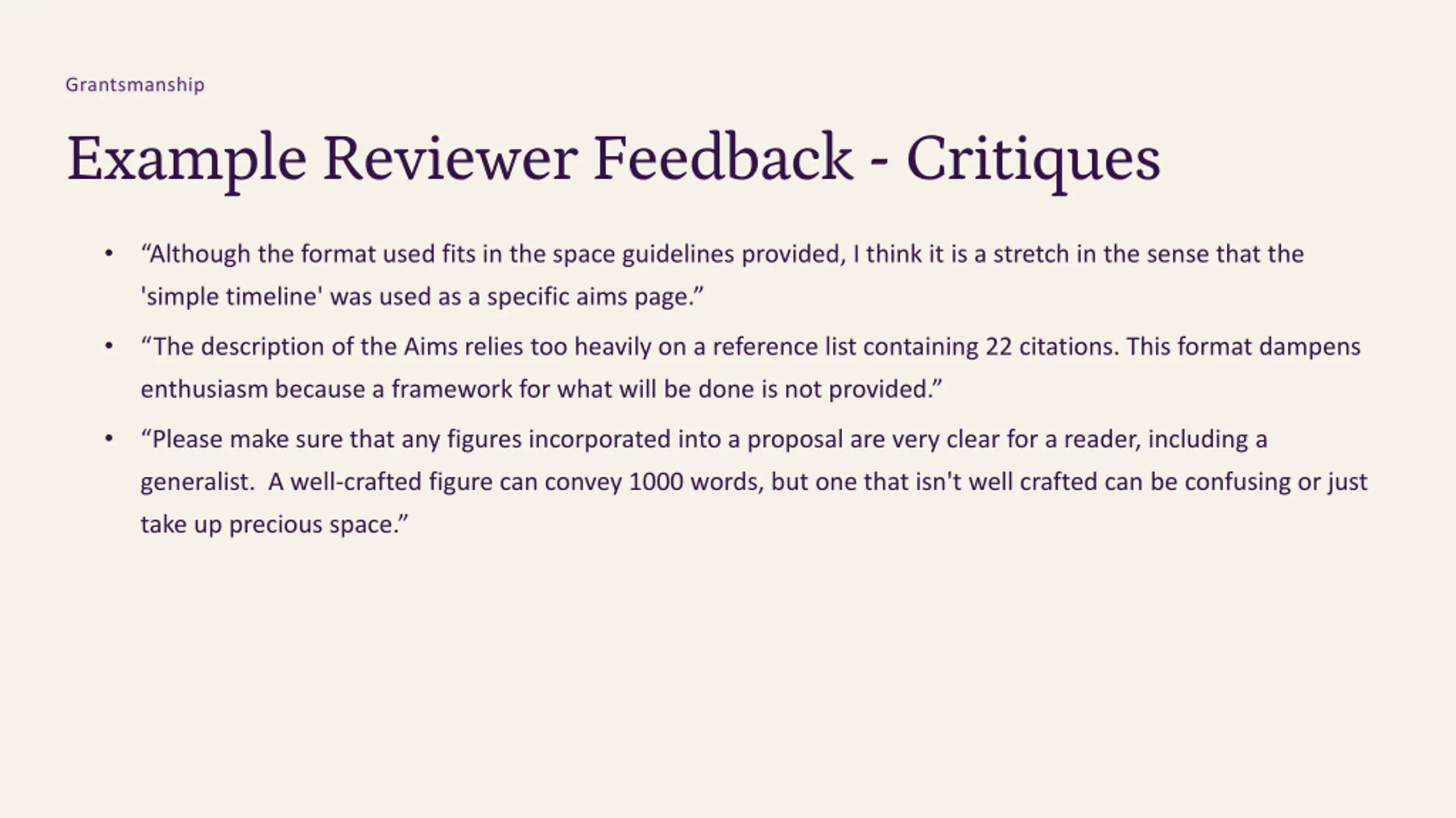 Grantsmanship Example Reviewer Feedback - Critiques Although the format used fits in the space guidelines provided, I think it is a stretch in the sense that the 'simple timeline' was used as a specific aims page. The description of the Aims relies too heavily on a reference list containing 22 citations. This format dampens enthusiasm because a framework for what will be done is not provided. Please make sure that any figures incorporated into a proposal are very clear for a reader, including a generalist. A well-crafted figure can convey 1000 words, but one that isn't well crafted can be confusing or just take up precious space.