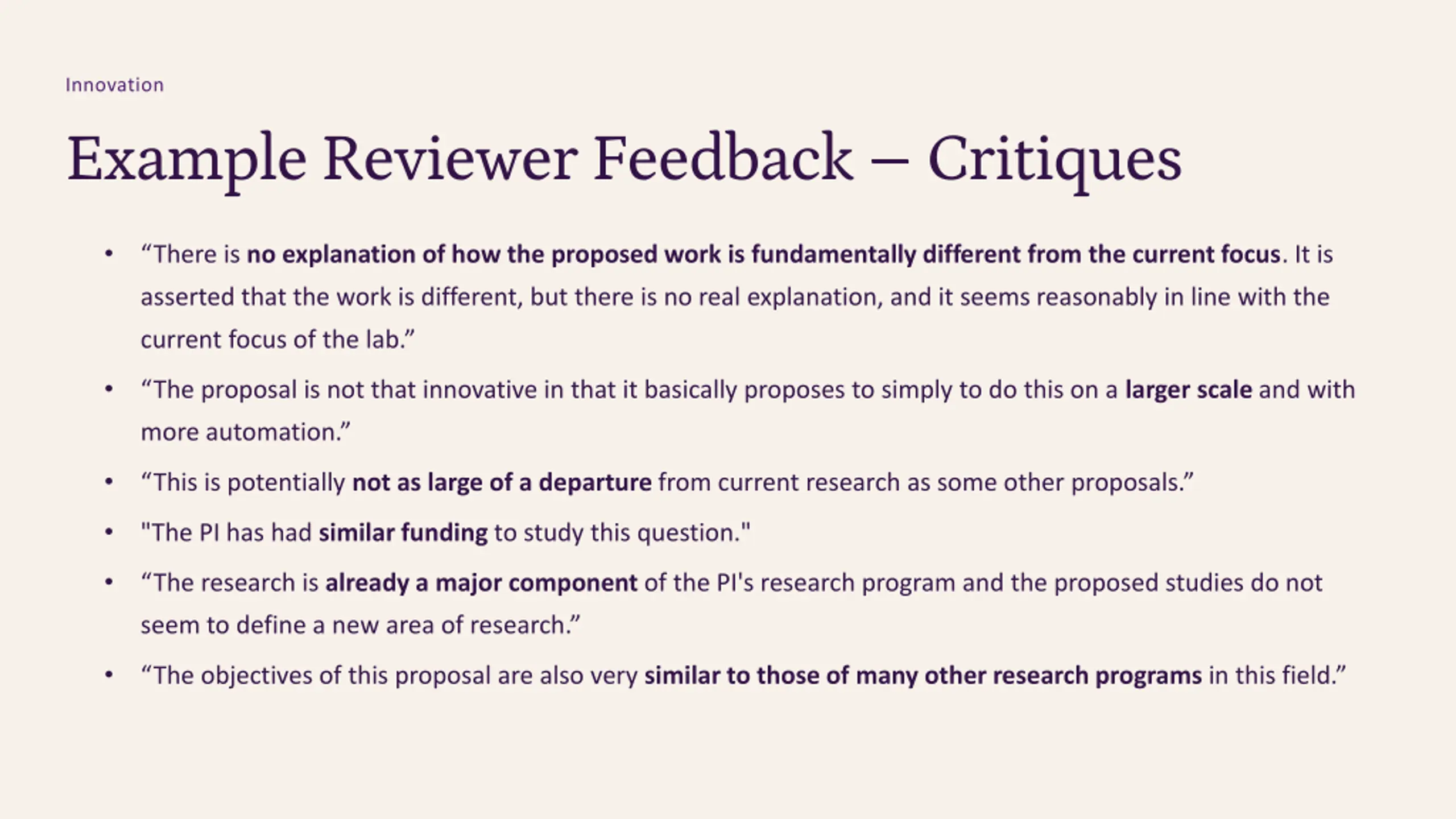 Innovation Example Reviewer Feedback Critiques There is no explanation of how the proposed work is fundamentally different from the current focus. It is asserted that the work is different, but there is no real explanation, and it seems reasonably in line with the current focus of the lab. The proposal is not that innovative in that it basically proposes to simply to do this on a larger scale and with more automation. This is potentially not as large of a departurefrom current research as some other proposals. "The PI has had similar funding to study this question." The research is already a major component of the PI's research program and the proposed studies do not seem to define a new area of research. The objectives of this proposal are also very similar to those of many other research programsin this field.