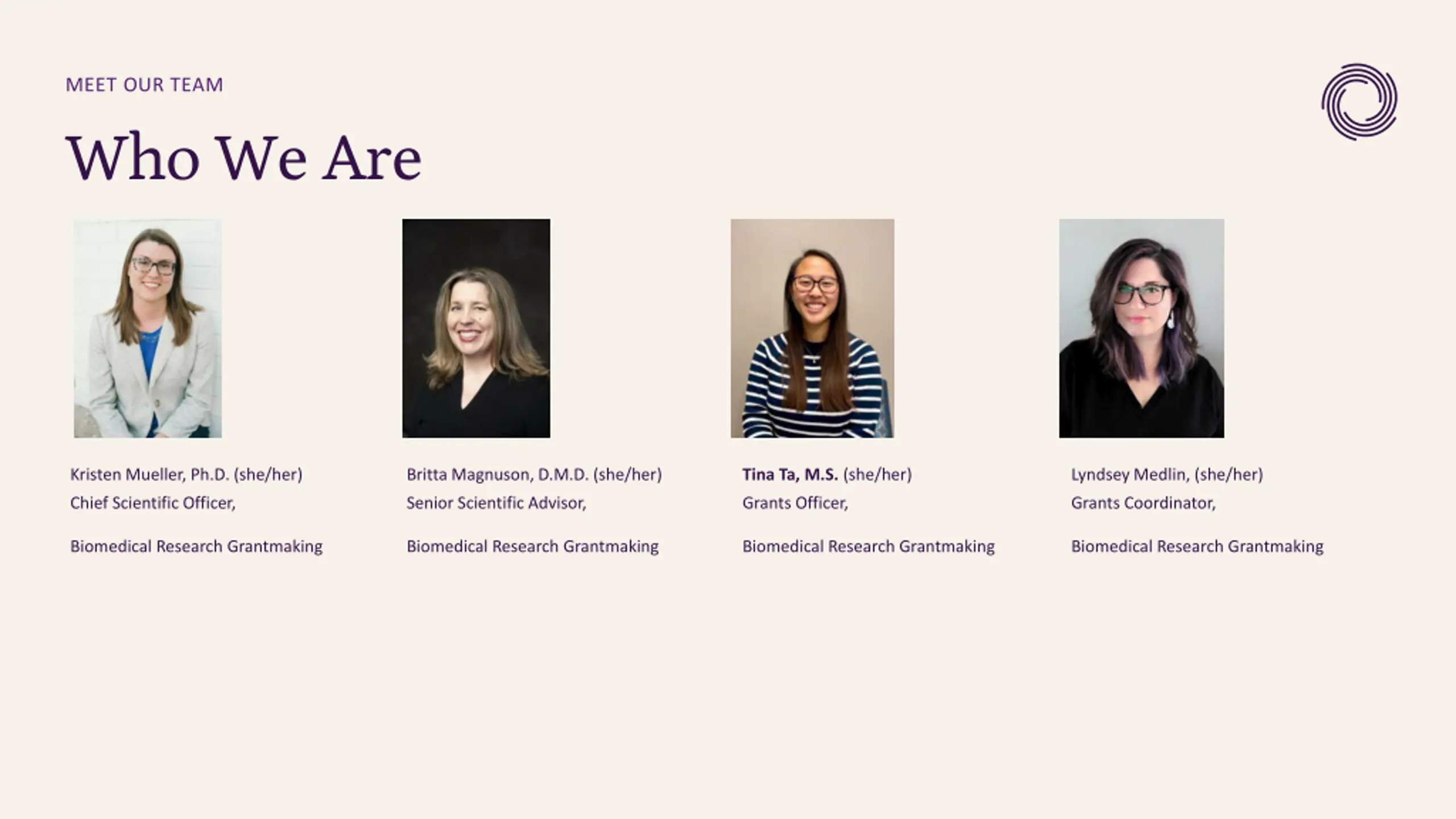 MEET OUR TEAM Who We Are Kristen Mueller, Ph.D. (she/her) Britta Magnuson, D.M.D. (she/her) Tina Ta, M.S. (she/her) Lyndsey Medlin, (she/her) Chief Scientific Officer, Senior Scientific Advisor, Grants Officer, Grants Coordinator, Biomedical Research Grantmaking Biomedical Research Grantmaking Biomedical Research Grantmaking Biomedical Research Grantmaking