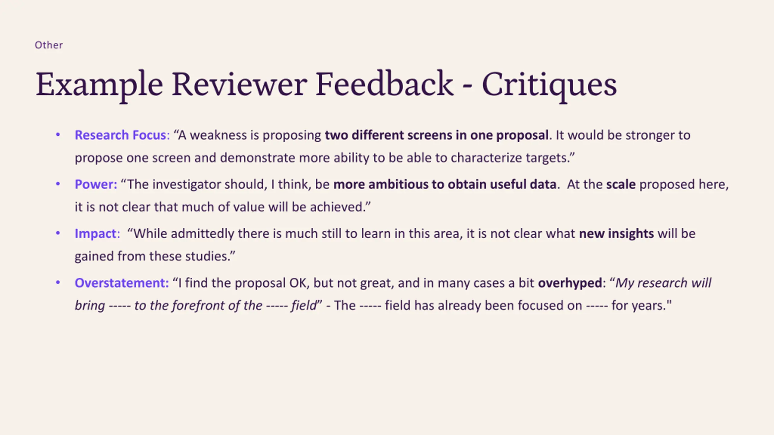 Other Example Reviewer Feedback - Critiques Research Focus: A weakness is proposing two different screens in one proposal. It would be stronger to propose one screen and demonstrate more ability to be able to characterize targets. Power: The investigator should, I think, be more ambitious to obtain useful data. At the scale proposed here, it is not clear that much of value will be achieved. Impact: While admittedly there is much still to learn in this area, it is not clear what new insights will be gained from these studies. Overstatement: I find the proposal OK, but not great, and in many cases a bit overhyped: My research will bring ----- to the forefront of the ----- field - The ----- field has already been focused on ----- for years."