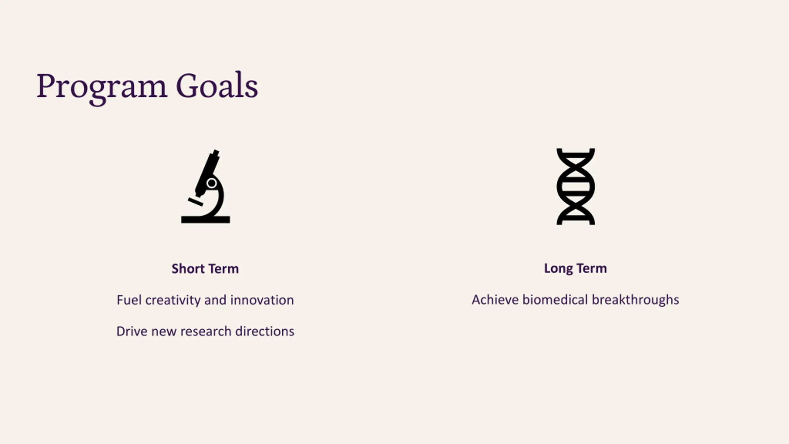 Program Goals Long Term Short Term Achieve biomedical breakthroughs Fuel creativity and innovation Drive new research directions