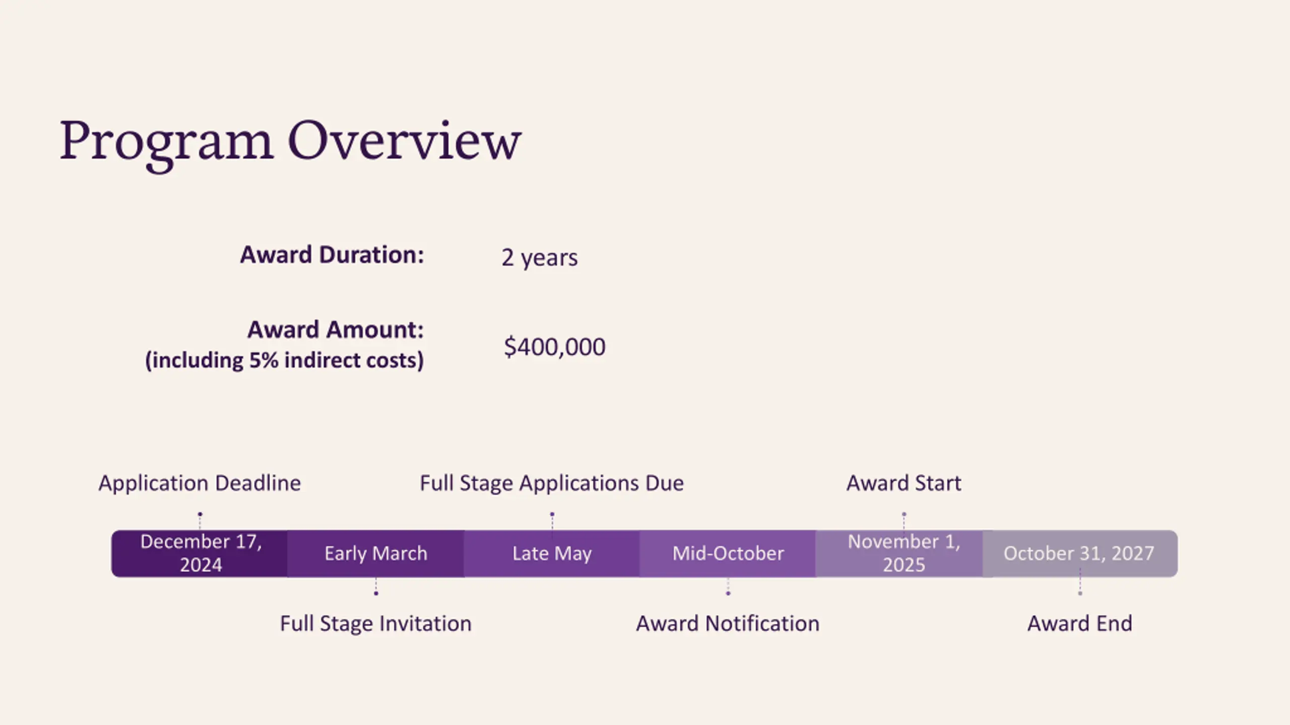 Program Overview Award Duration: 2 years Award Amount: $400,000 (including 5% indirect costs) Application Deadline Full Stage Applications Due Award Start December 17, 2024 November 1, 2025 Early March Late May Mid-October October 31, 2027 Full Stage Invitation Award Notification Award End