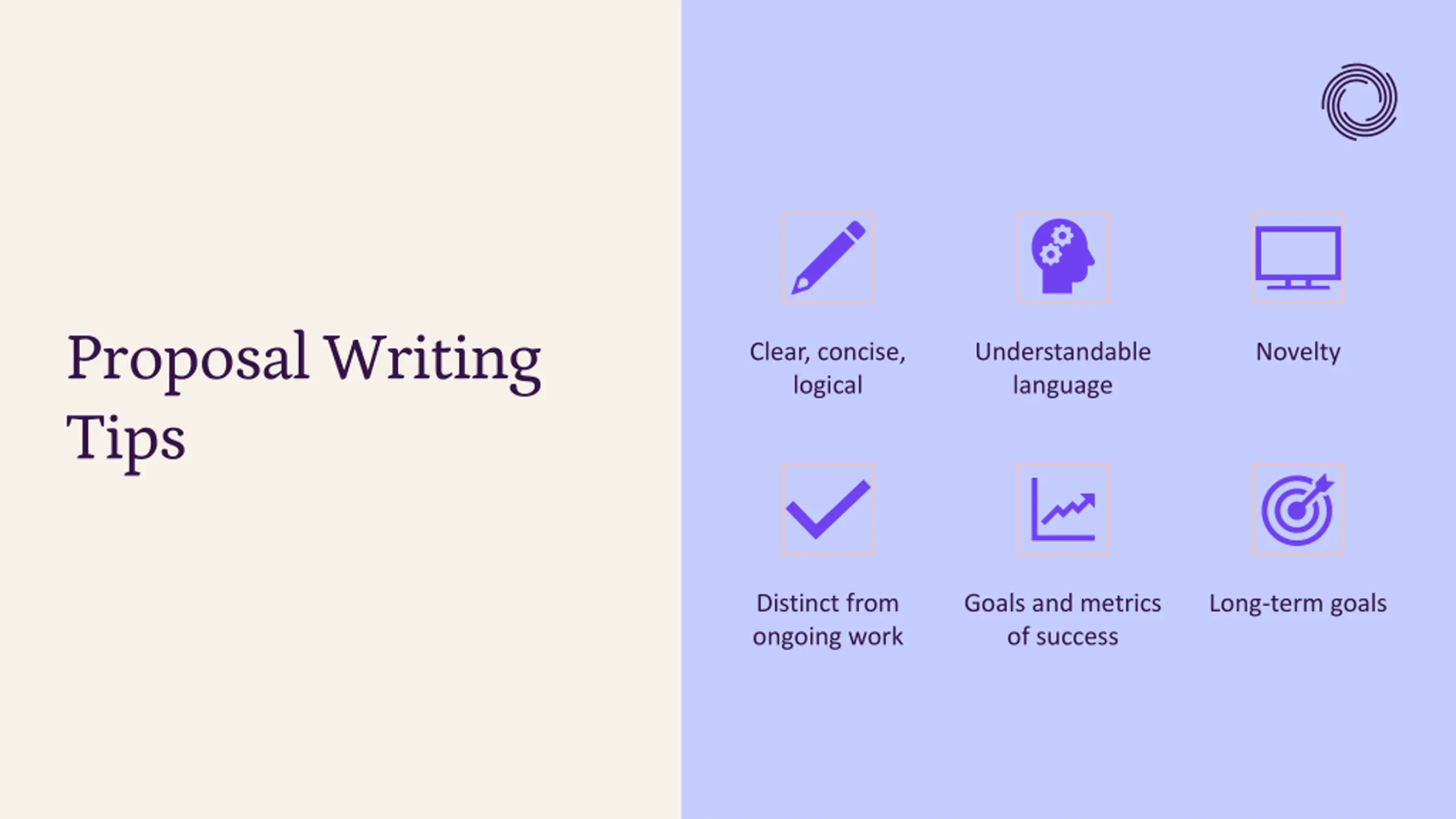Proposal Writing Tips Clear, concise, logical Understandable language Novelty Distinct from ongoing work Goals and metrics of success Long-term goals