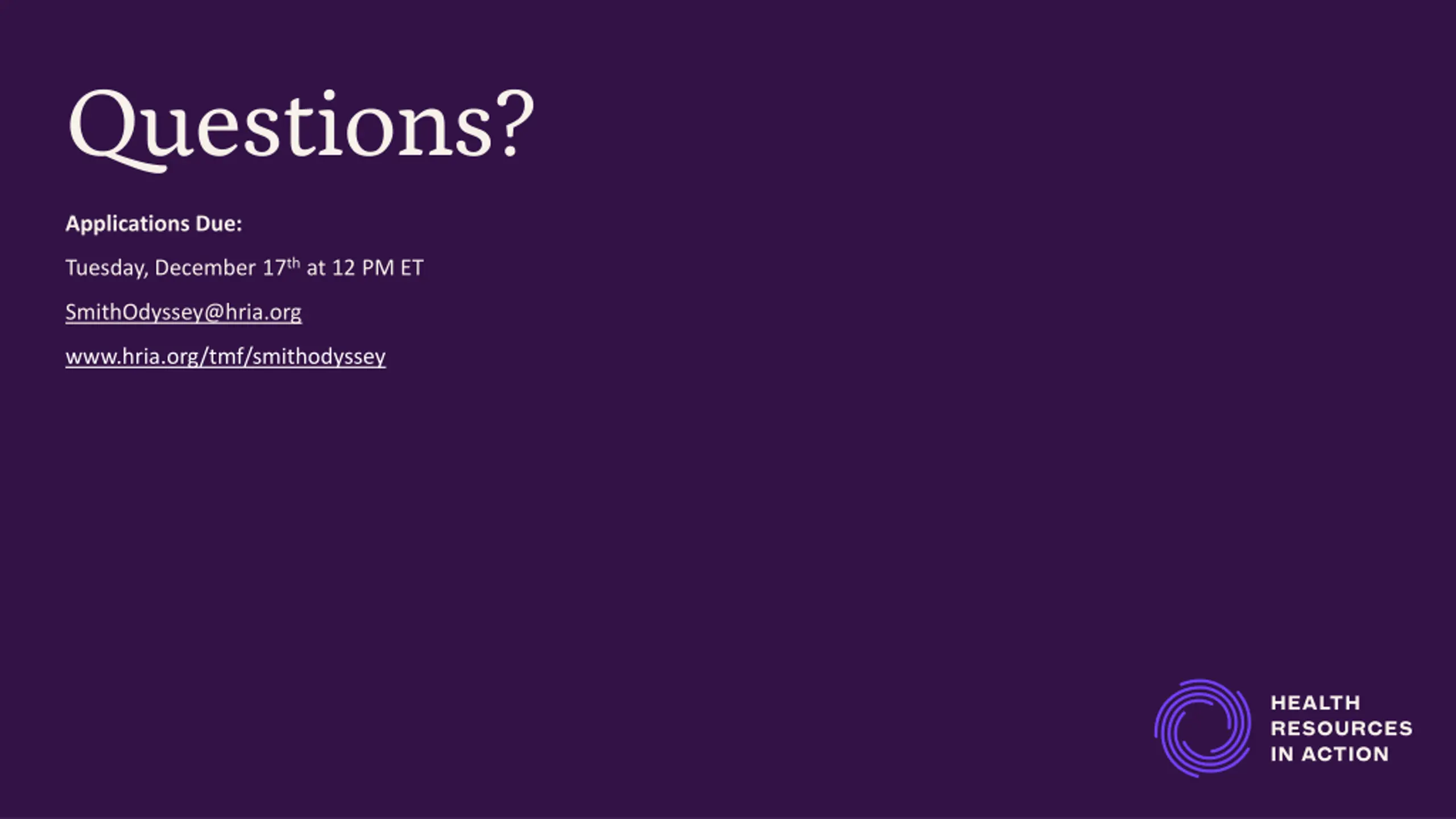 Questions? Applications Due: Tuesday, December 17th at 12 PM ET SmithOdyssey@hria.org www.hria.org/tmf/smithodyssey