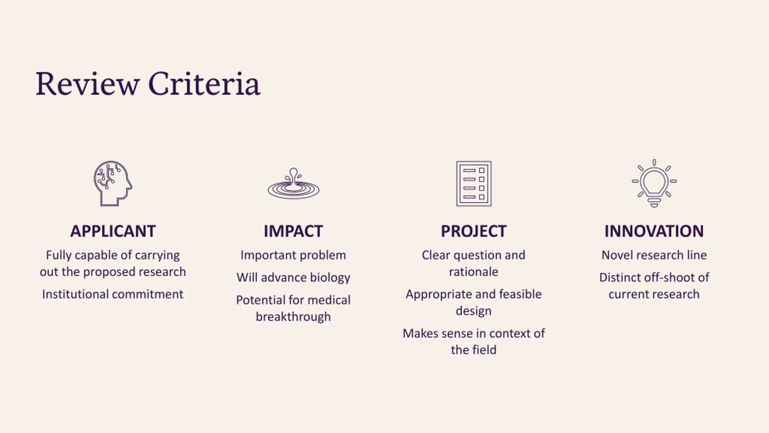 Review Criteria APPLICANT IMPACT PROJECT INNOVATION Fully capable of carrying out the proposed research Important problem Clear question and rationale Novel research line Will advance biology Distinct off-shoot of current research Institutional commitment Appropriate and feasible design Potential for medical breakthrough Makes sense in context of the field