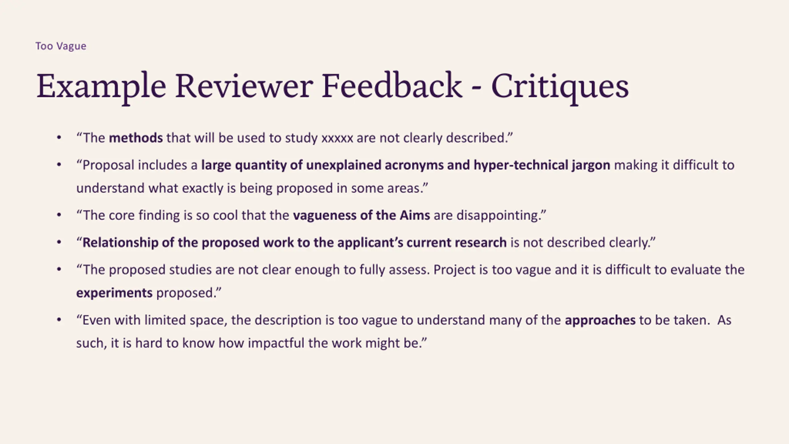 Too Vague Example Reviewer Feedback - Critiques The methods that will be used to study xxxxx are not clearly described. Proposal includes a large quantity of unexplained acronyms and hyper-technical jargon making it difficult to understand what exactly is being proposed in some areas. The core finding is so cool that the vagueness of the Aimsare disappointing. Relationship of the proposed work to the applicant s current research is not described clearly. The proposed studies are not clear enough to fully assess. Project is too vague and it is difficult to evaluate the experimentsproposed. Even with limited space, the description is too vague to understand many of the approaches to be taken. As such, it is hard to know how impactful the work might be.