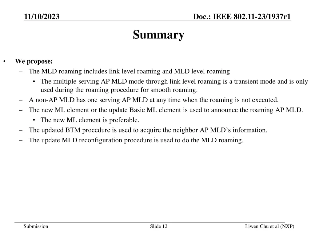11/10/2023 Doc.: IEEE 802.11-23/1937r1 Summary We propose: The MLD roaming includes link level roaming and MLD level roaming The multiple serving AP MLD mode through link level roaming is a transient mode and is only used during the roaming procedure for smooth roaming. A non-AP MLD has one serving AP MLD at any time when the roaming is not executed. The new ML element or the update Basic ML element is used to announce the roaming AP MLD. The new ML element is preferable. The updated BTM procedure is used to acquire the neighbor AP MLD s information. The update MLD reconfiguration procedure is used to do the MLD roaming. Submission Slide 12 Liwen Chu et al (NXP)
