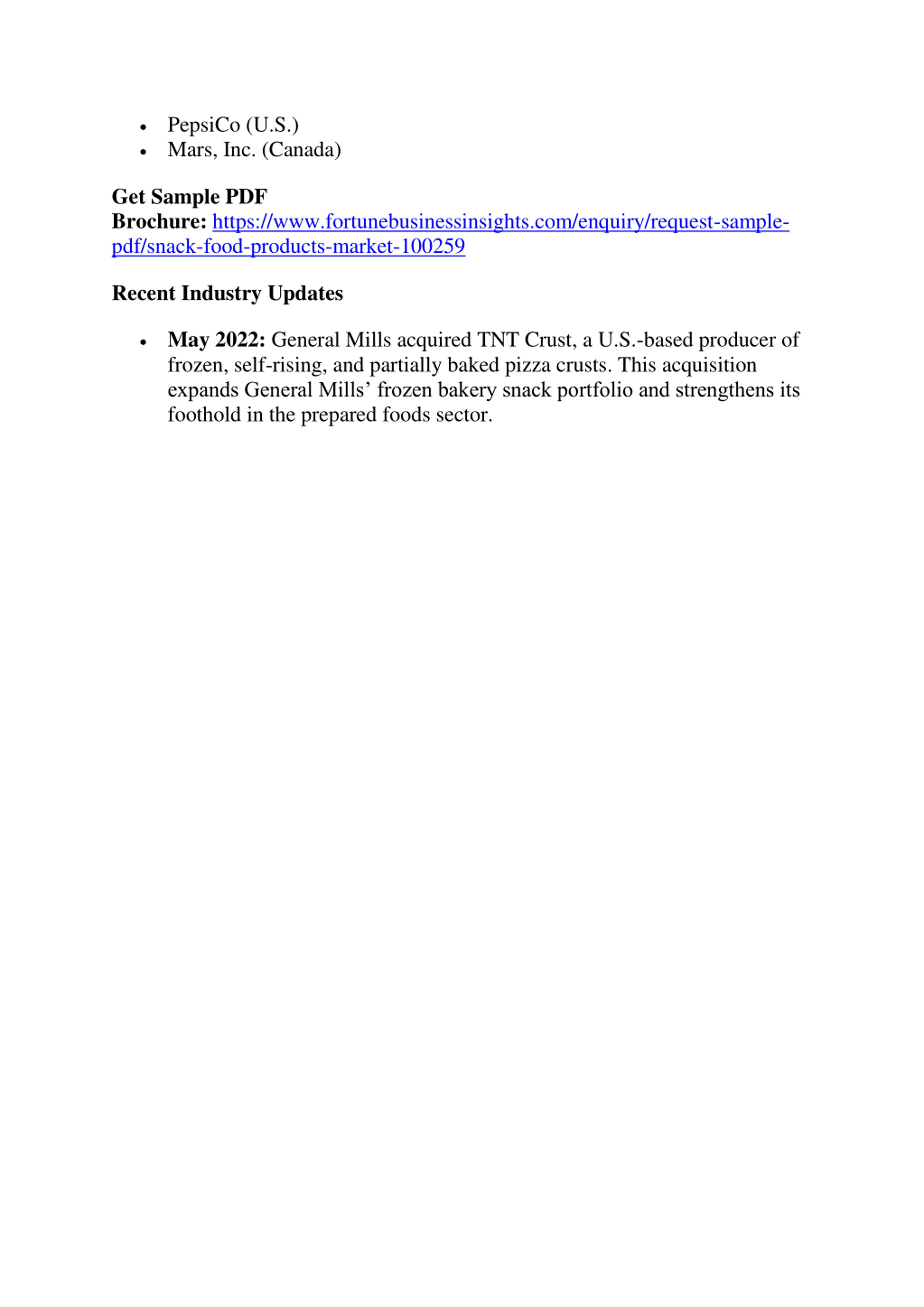 PepsiCo (U.S.) Mars, Inc. (Canada) Get Sample PDF Brochure: https://www.fortunebusinessinsights.com/enquiry/request-sample- pdf/snack-food-products-market-100259 Recent Industry Updates May 2022: General Mills acquired TNT Crust, a U.S.-based producer of frozen, self-rising, and partially baked pizza crusts. This acquisition expands General Mills frozen bakery snack portfolio and strengthens its foothold in the prepared foods sector.