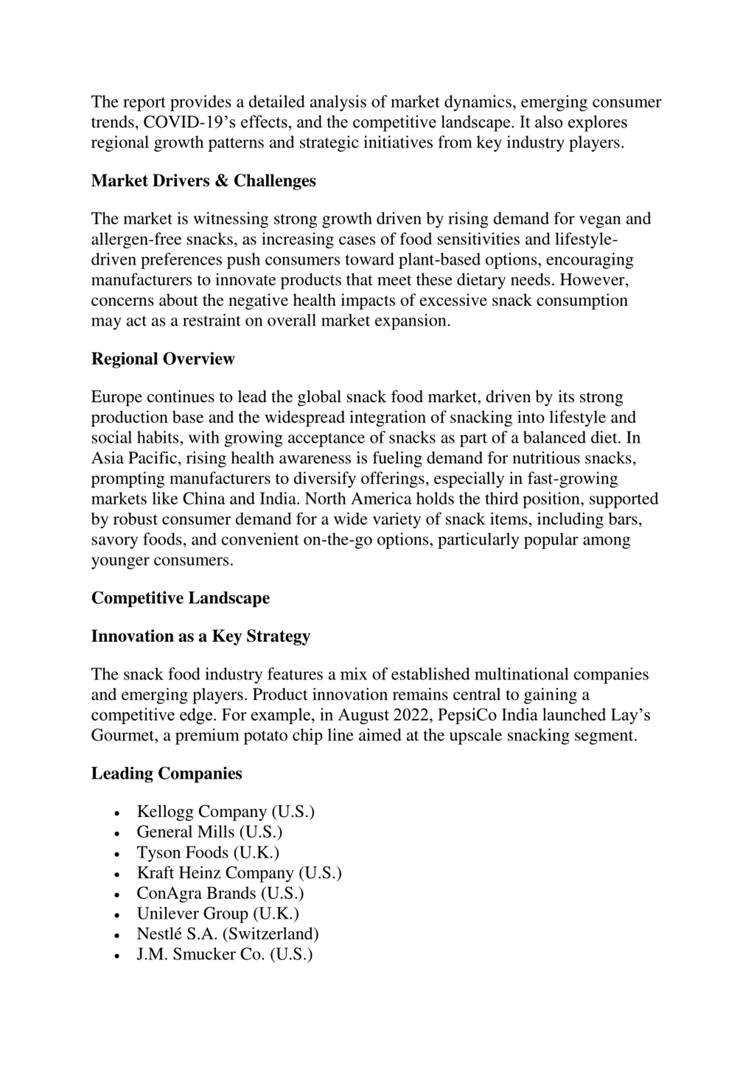 The report provides a detailed analysis of market dynamics, emerging consumer trends, COVID-19 s effects, and the competitive landscape. It also explores regional growth patterns and strategic initiatives from key industry players. Market Drivers & Challenges The market is witnessing strong growth driven by rising demand for vegan and allergen-free snacks, as increasing cases of food sensitivities and lifestyle- driven preferences push consumers toward plant-based options, encouraging manufacturers to innovate products that meet these dietary needs. However, concerns about the negative health impacts of excessive snack consumption may act as a restraint on overall market expansion. Regional Overview Europe continues to lead the global snack food market, driven by its strong production base and the widespread integration of snacking into lifestyle and social habits, with growing acceptance of snacks as part of a balanced diet. In Asia Pacific, rising health awareness is fueling demand for nutritious snacks, prompting manufacturers to diversify offerings, especially in fast-growing markets like China and India. North America holds the third position, supported by robust consumer demand for a wide variety of snack items, including bars, savory foods, and convenient on-the-go options, particularly popular among younger consumers. Competitive Landscape Innovation as a Key Strategy The snack food industry features a mix of established multinational companies and emerging players. Product innovation remains central to gaining a competitive edge. For example, in August 2022, PepsiCo India launched Lay s Gourmet, a premium potato chip line aimed at the upscale snacking segment. Leading Companies Kellogg Company (U.S.) General Mills (U.S.) Tyson Foods (U.K.) Kraft Heinz Company (U.S.) ConAgra Brands (U.S.) Unilever Group (U.K.) Nestl S.A. (Switzerland) J.M. Smucker Co. (U.S.)