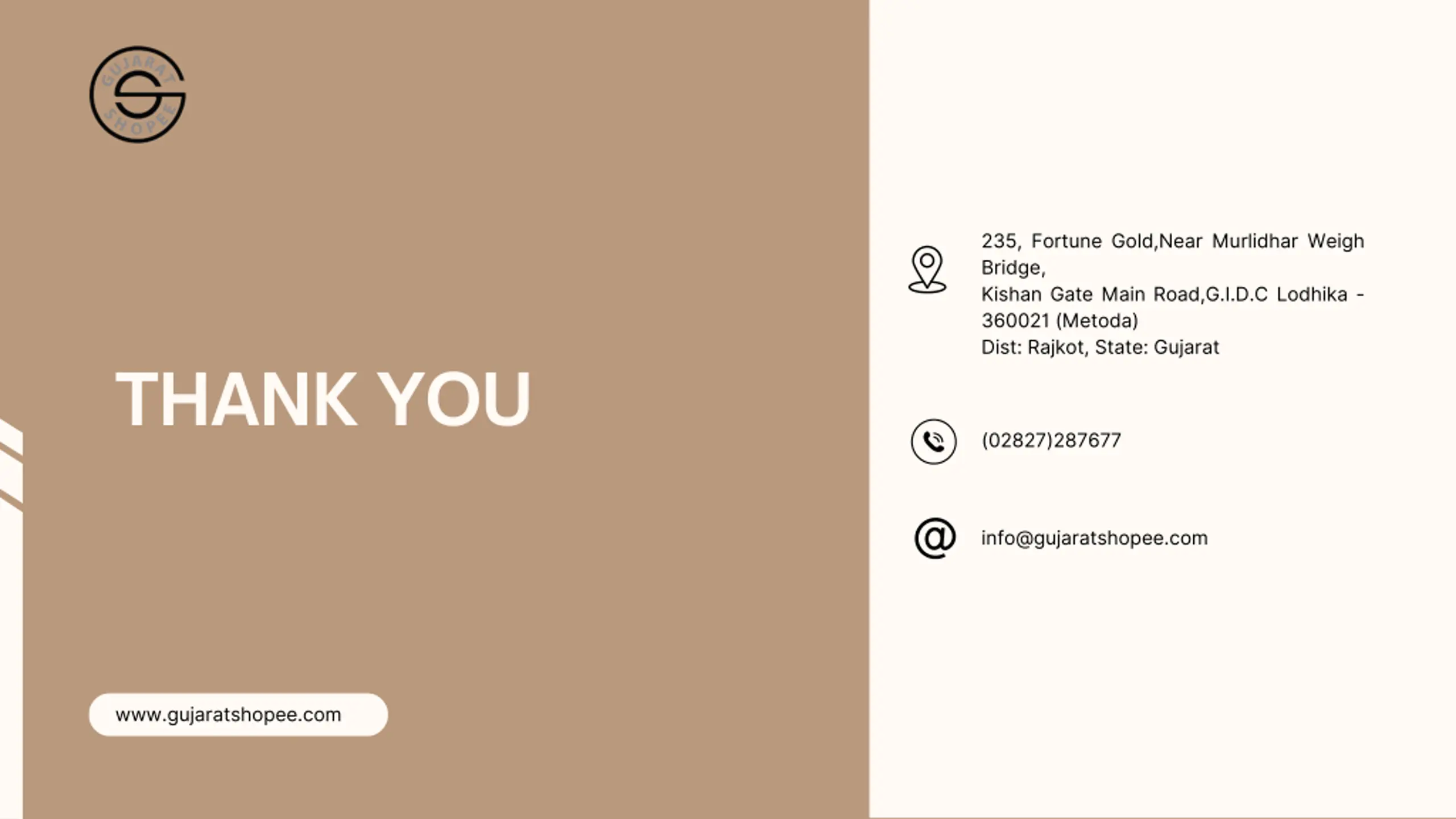 235, Fortune Gold,Near Murlidhar Weigh Bridge, Kishan Gate Main Road,G.I.D.C Lodhika - 360021 (Metoda) Dist: Rajkot, State: Gujarat THANK YOU (02827)287677 info@gujaratshopee.com www.gujaratshopee.com