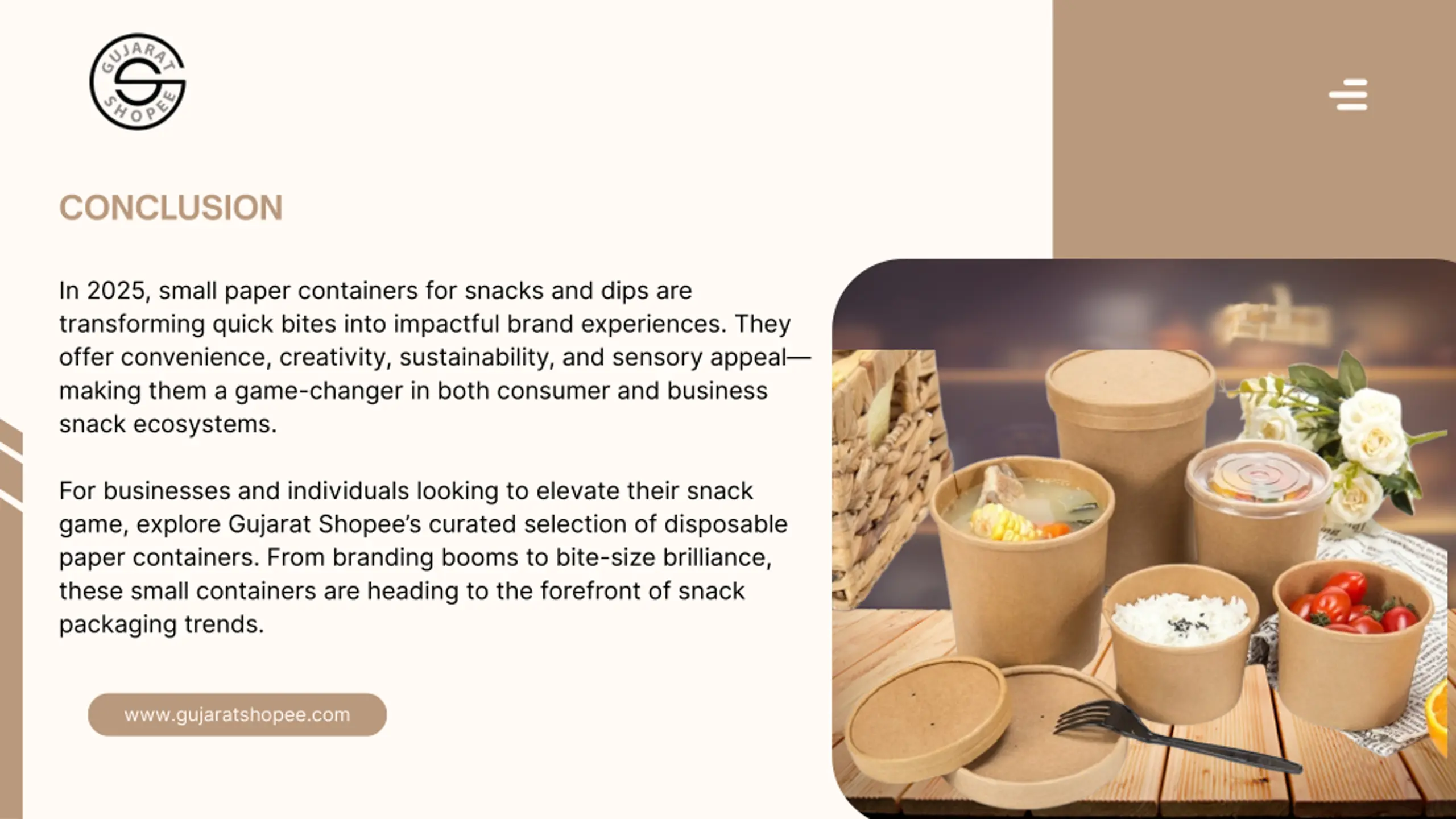 CONCLUSION In 2025, small paper containers for snacks and dips are transforming quick bites into impactful brand experiences. They offer convenience, creativity, sustainability, and sensory appeal making them a game-changer in both consumer and business snack ecosystems. For businesses and individuals looking to elevate their snack game, explore Gujarat Shopee s curated selection of disposable paper containers. From branding booms to bite-size brilliance, these small containers are heading to the forefront of snack packaging trends. www.gujaratshopee.com