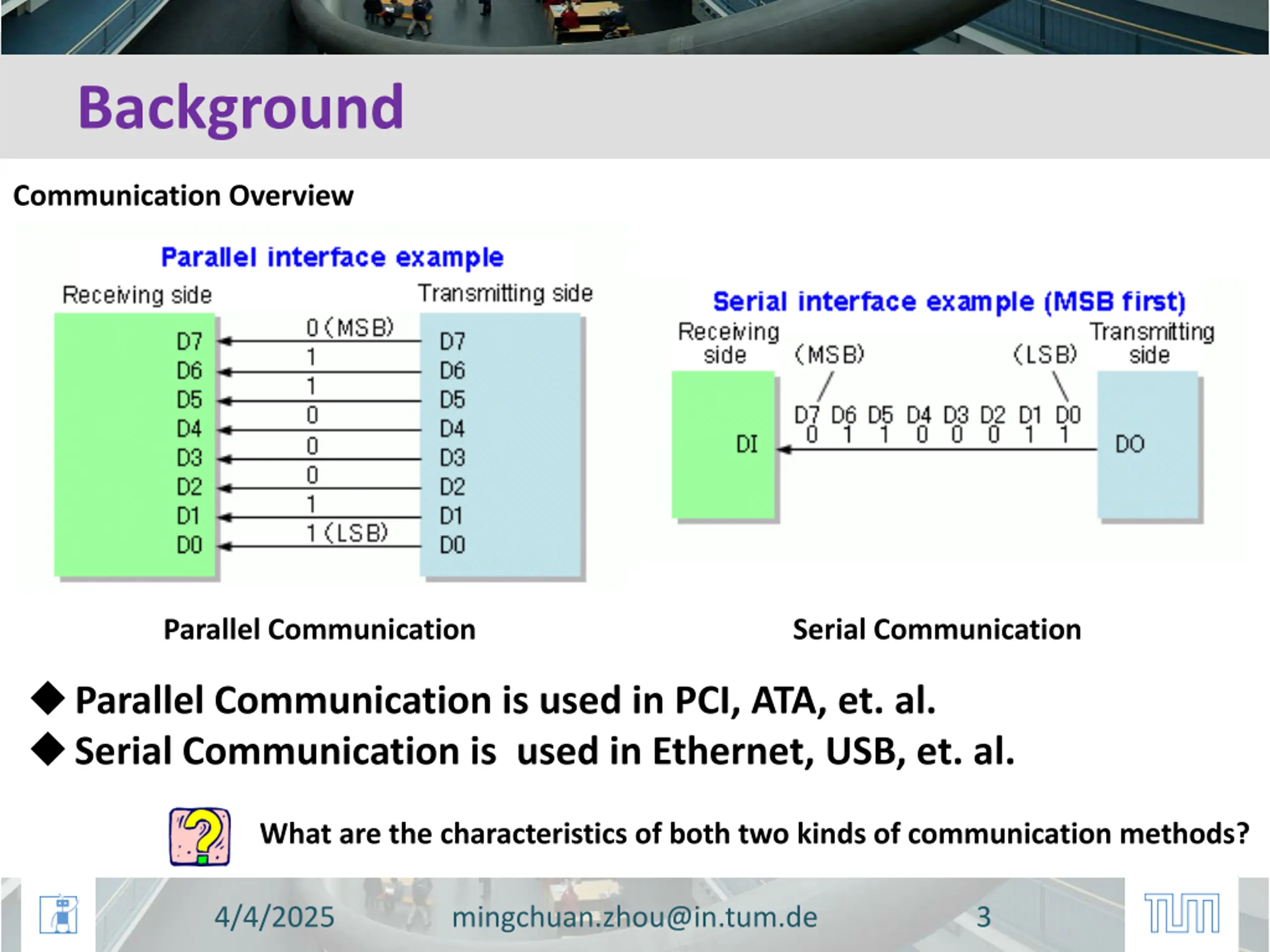 Background Communication Overview Parallel Communication Serial Communication Parallel Communication is used in PCI, ATA, et. al. Serial Communication is used in Ethernet, USB, et. al. What are the characteristics of both two kinds of communication methods? 4/4/2025 mingchuan.zhou@in.tum.de 3