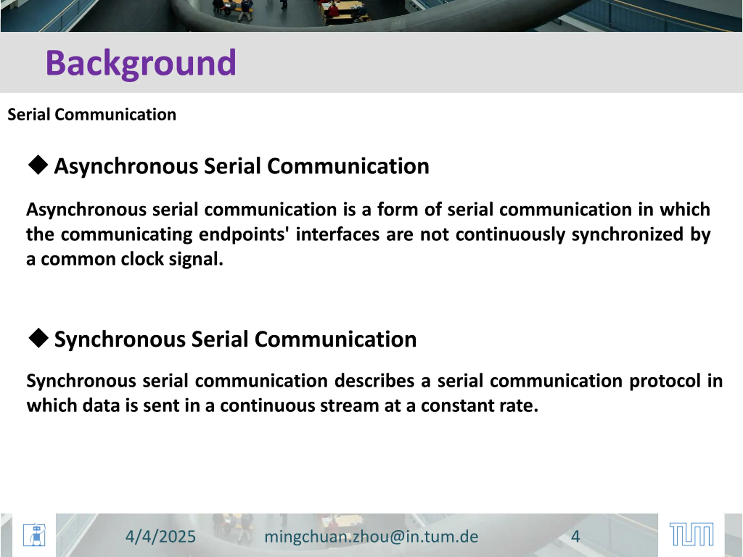 Background Serial Communication Asynchronous Serial Communication Asynchronous serial communication is a form of serial communication in which the communicating endpoints' interfaces are not continuously synchronized by a common clock signal. Synchronous Serial Communication Synchronous serial communication describes a serial communication protocol in which data is sent in a continuous stream at a constant rate. 4/4/2025 mingchuan.zhou@in.tum.de 4