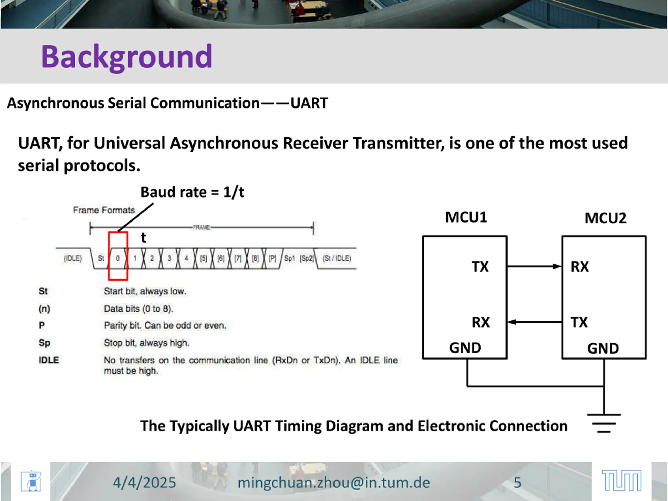 Background Asynchronous Serial Communication UART UART, for Universal Asynchronous Receiver Transmitter, is one of the most used serial protocols. Baud rate = 1/t MCU1 MCU2 t TX RX RX TX GND GND The Typically UART Timing Diagram and Electronic Connection 4/4/2025 mingchuan.zhou@in.tum.de 5