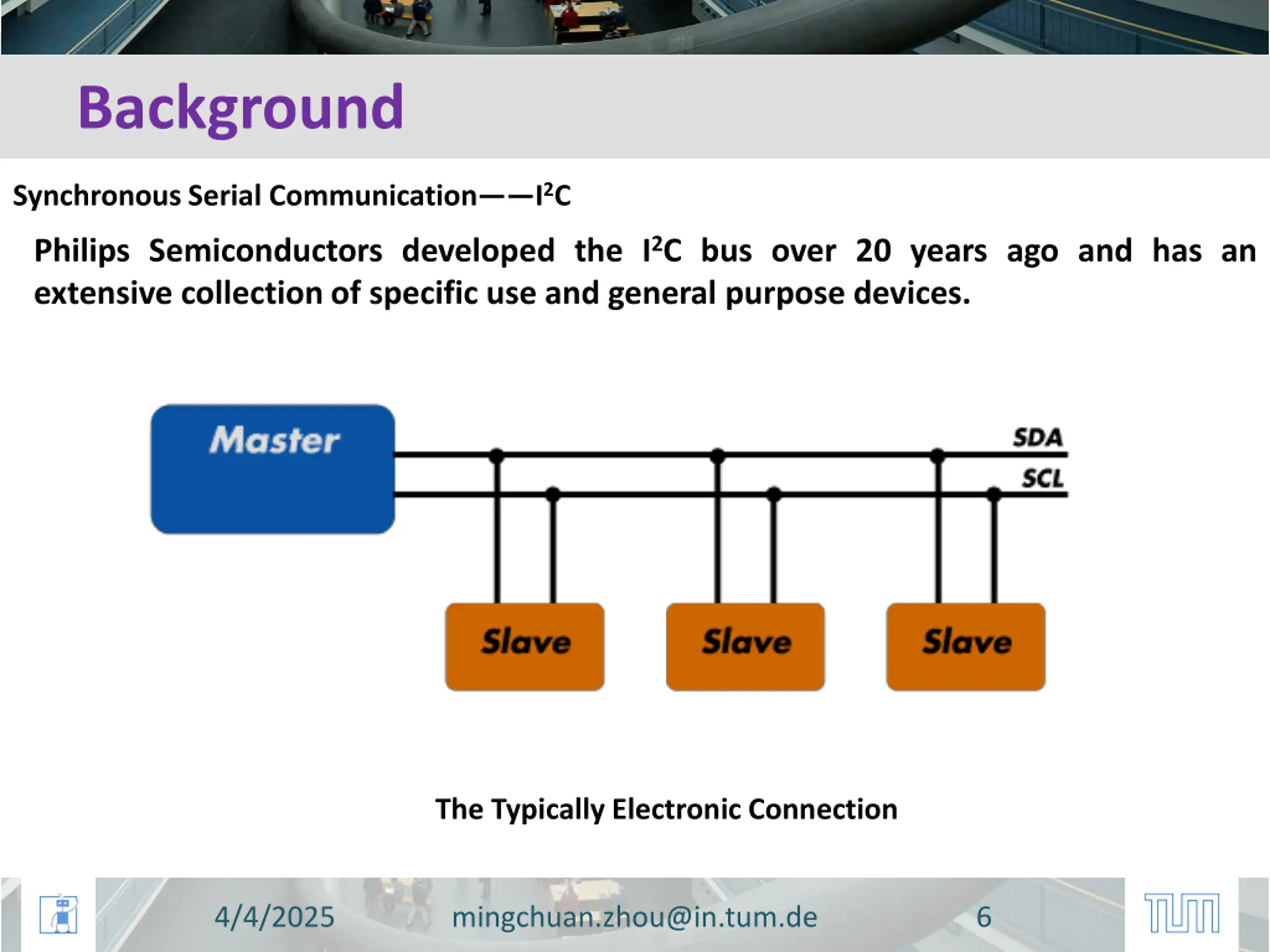 Background Synchronous Serial Communication I2C Philips Semiconductors developed the I2C bus over 20 years ago and has an extensive collection of specific use and general purpose devices. The Typically Electronic Connection 4/4/2025 mingchuan.zhou@in.tum.de 6