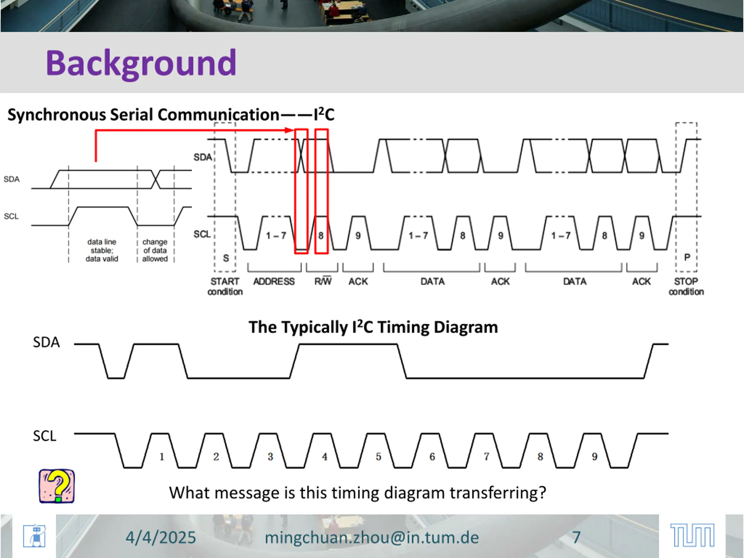 Background Synchronous Serial Communication I2C The Typically I2C Timing Diagram SDA SCL What message is this timing diagram transferring? 4/4/2025 mingchuan.zhou@in.tum.de 7
