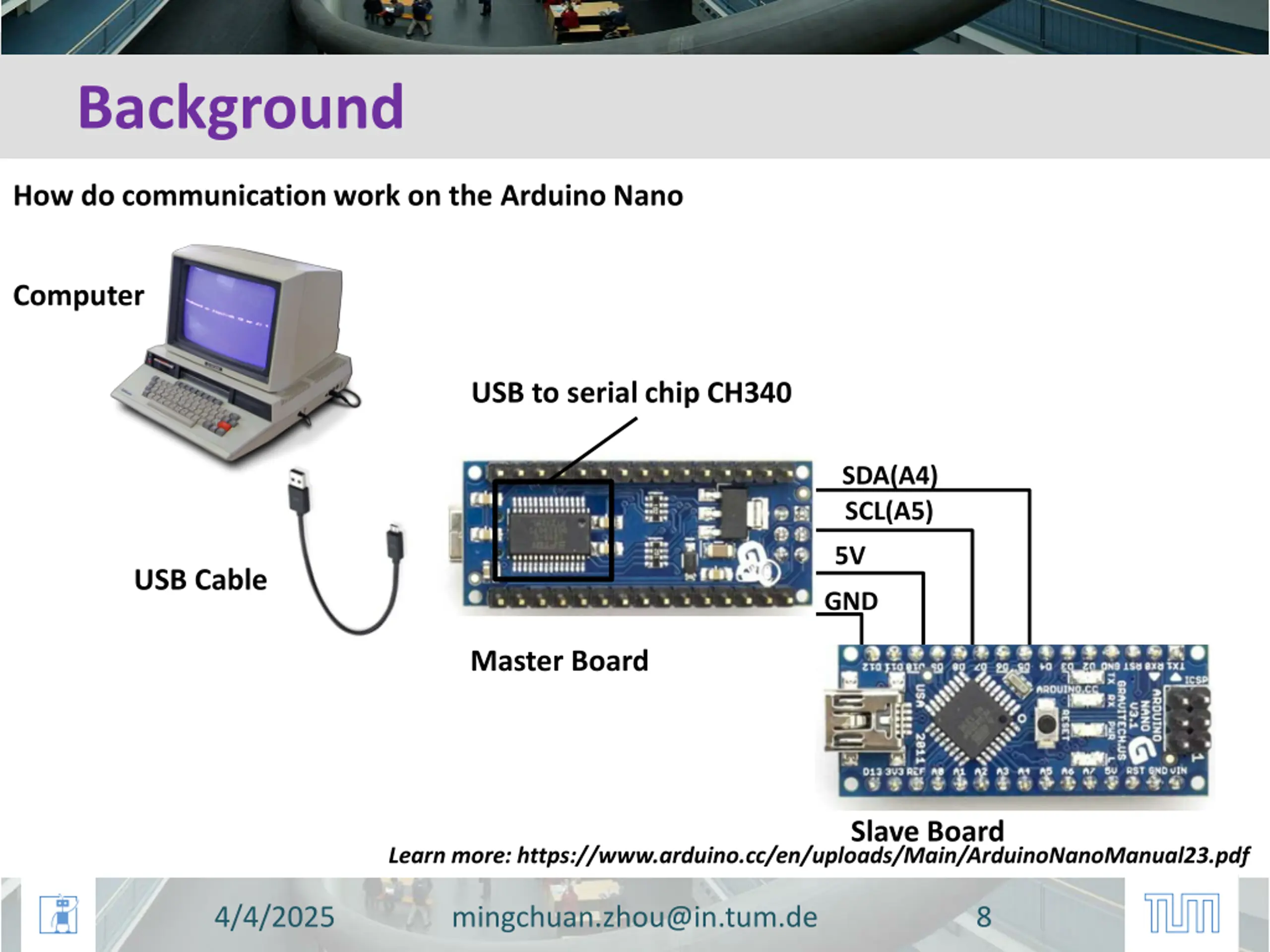 Background How do communication work on the Arduino Nano Computer USB to serial chip CH340 SDA(A4) SCL(A5) 5V USB Cable GND Master Board Slave Board Learn more: https://www.arduino.cc/en/uploads/Main/ArduinoNanoManual23.pdf 4/4/2025 mingchuan.zhou@in.tum.de 8