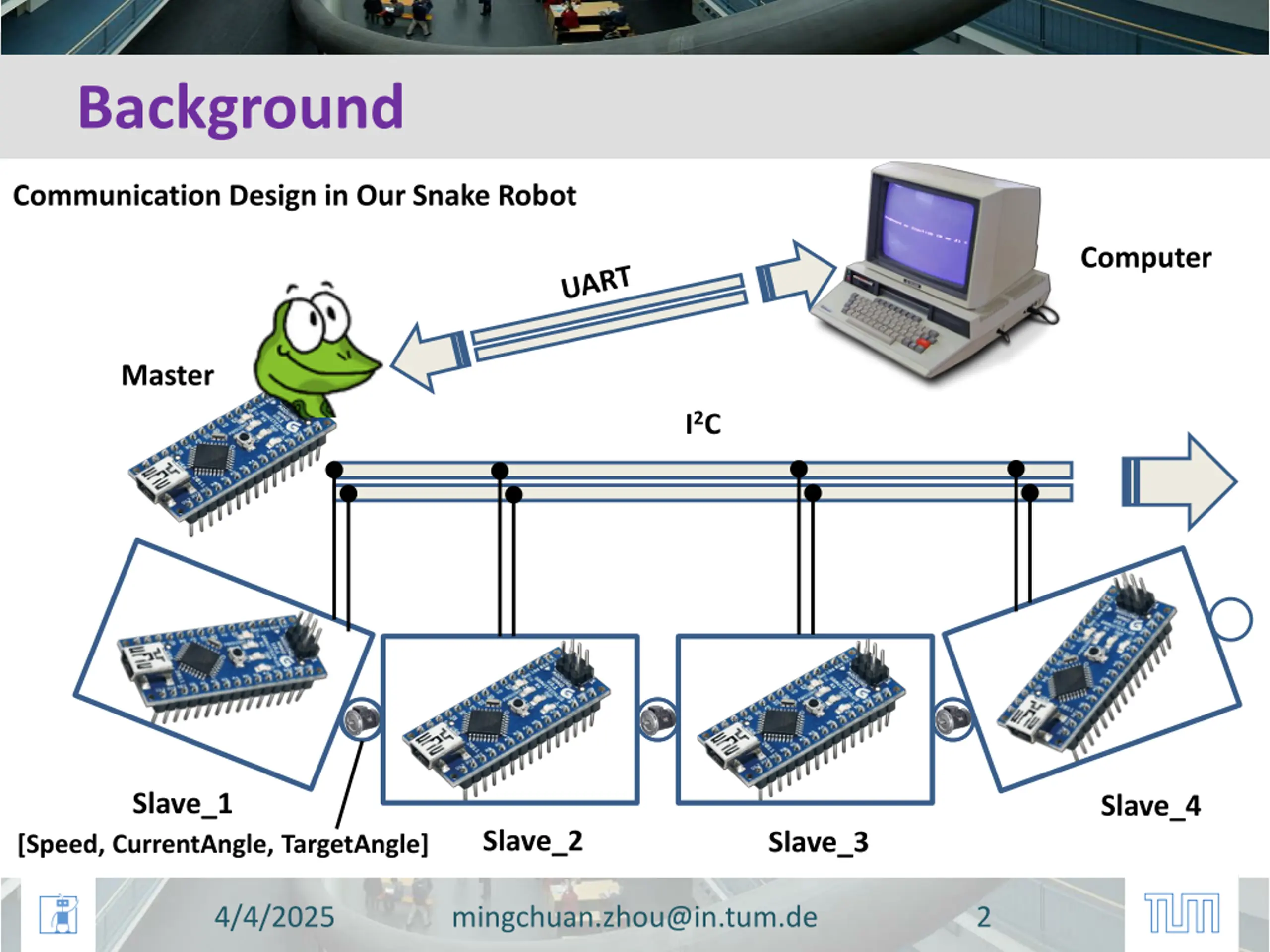 Background Communication Design in Our Snake Robot Computer Master I2C Slave_1 Slave_4 Slave_2 Slave_3 [Speed, CurrentAngle, TargetAngle] 4/4/2025 mingchuan.zhou@in.tum.de 2