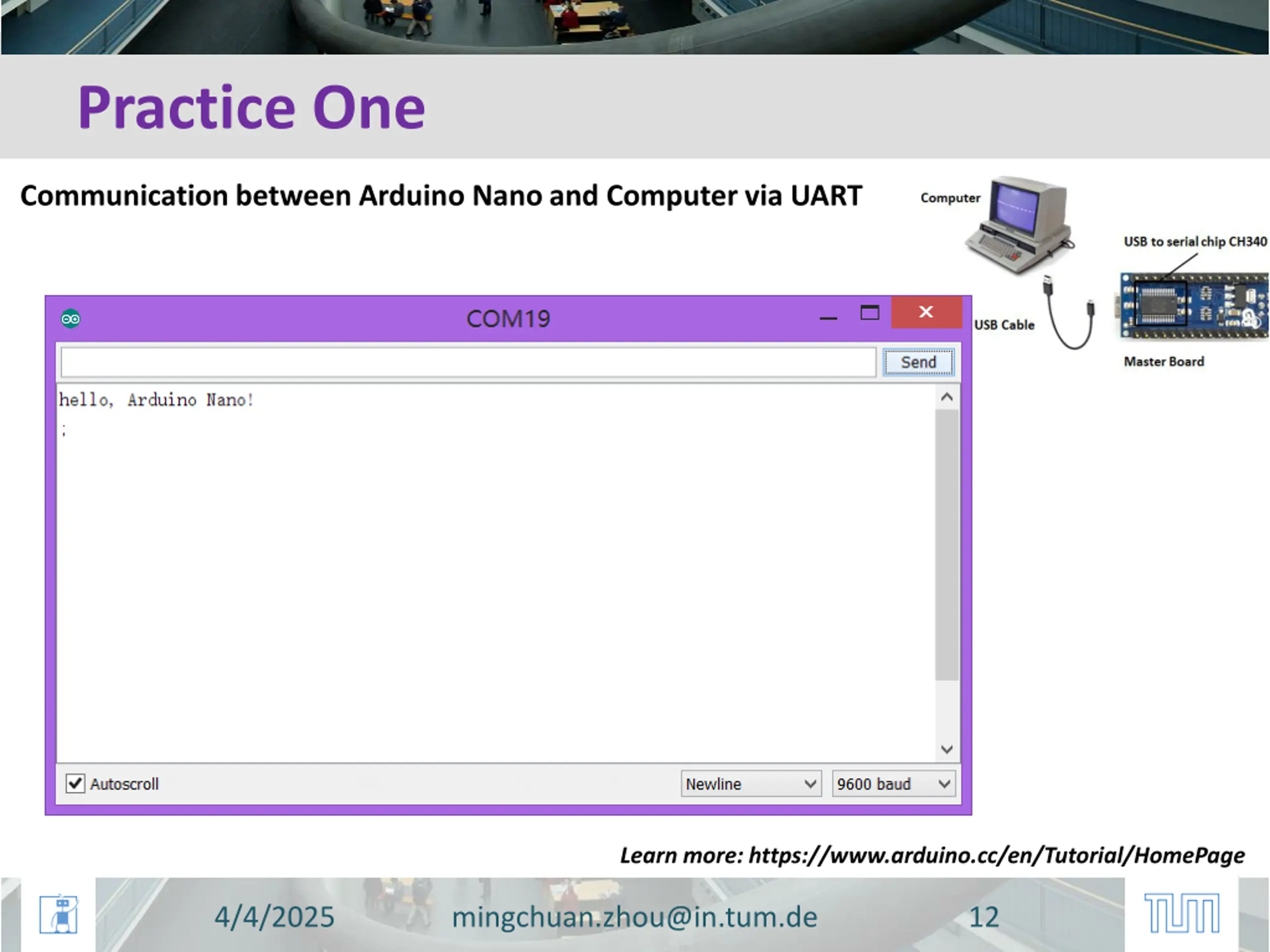 Practice One Communication between Arduino Nano and Computer via UART Learn more: https://www.arduino.cc/en/Tutorial/HomePage 4/4/2025 mingchuan.zhou@in.tum.de 12
