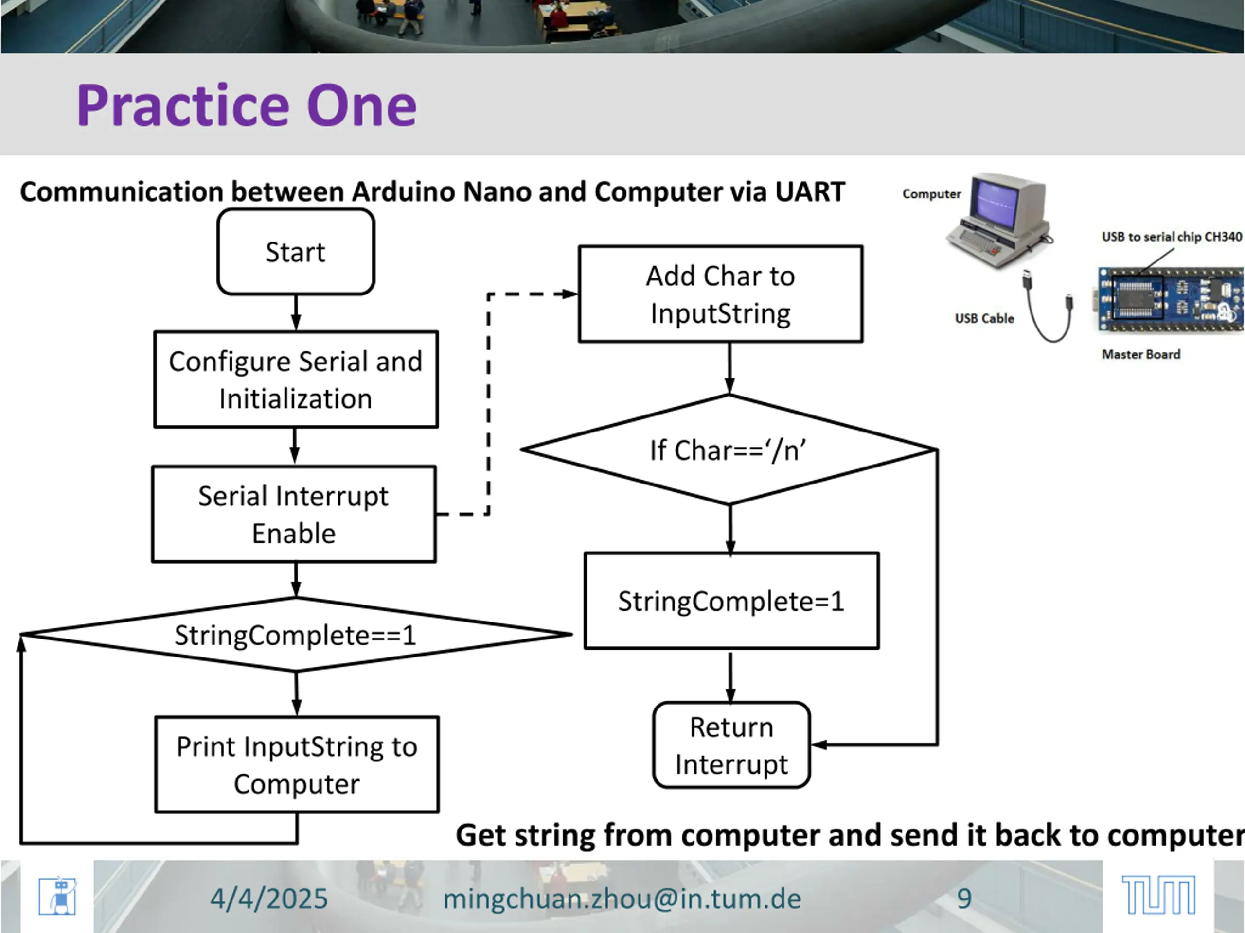 Practice One Communication between Arduino Nano and Computer via UART Start Add Char to InputString Configure Serial and Initialization If Char== /n Serial Interrupt Enable StringComplete=1 StringComplete==1 Return Interrupt Print InputString to Computer Get string from computer and send it back to computer 4/4/2025 mingchuan.zhou@in.tum.de 9
