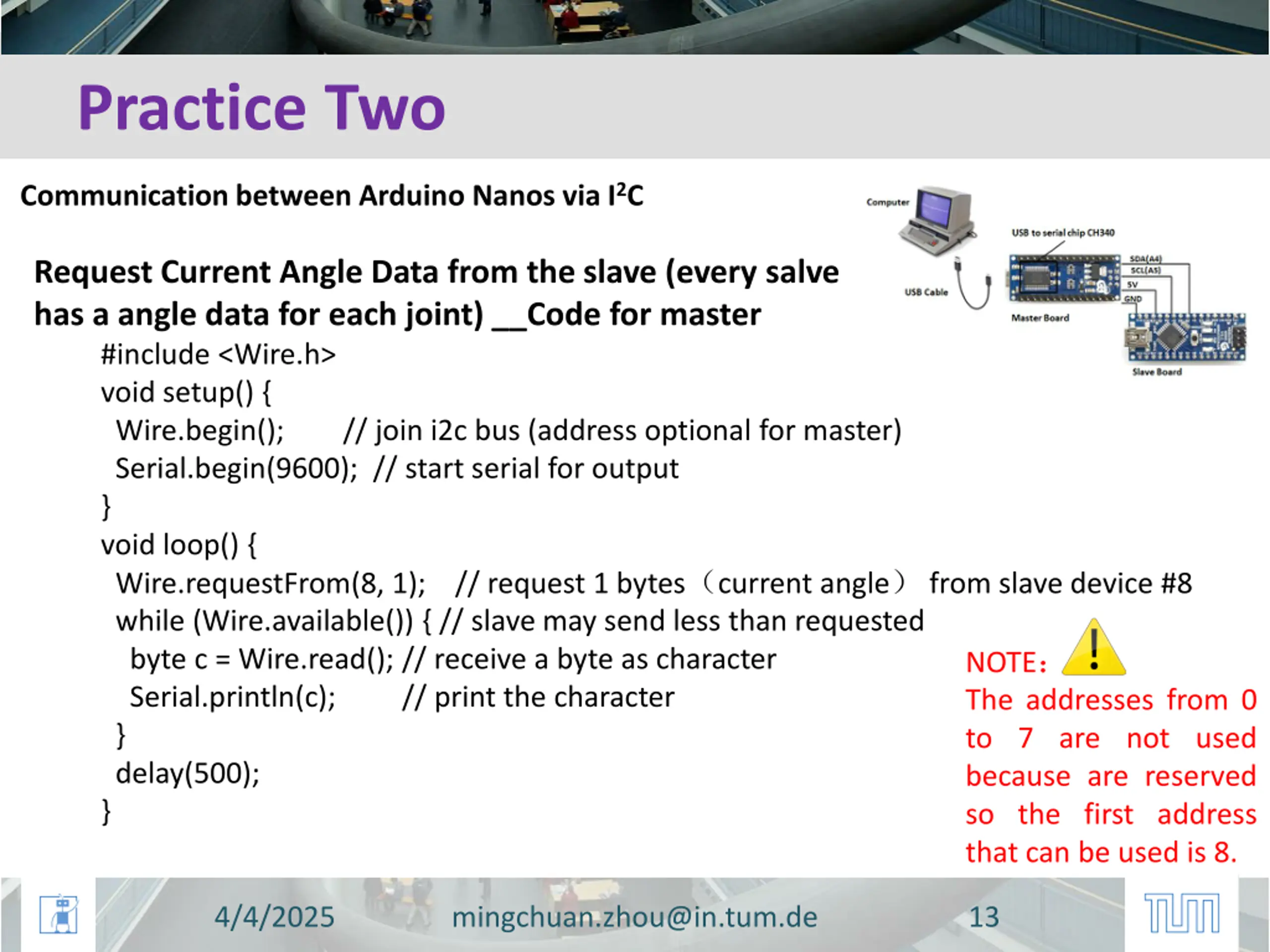 Practice Two Communication between Arduino Nanos via I2C Request Current Angle Data from the slave (every salve has a angle data for each joint) __Code for master #include <Wire.h> void setup() { Wire.begin(); // join i2c bus (address optional for master) Serial.begin(9600); // start serial for output } void loop() { Wire.requestFrom(8, 1); // request 1 bytes current angle from slave device #8 while (Wire.available()) { // slave may send less than requested byte c = Wire.read(); // receive a byte as character Serial.println(c); // print the character } delay(500); } NOTE The addresses from 0 to 7 are not used because are reserved so the first address that can be used is 8. 4/4/2025 mingchuan.zhou@in.tum.de 13