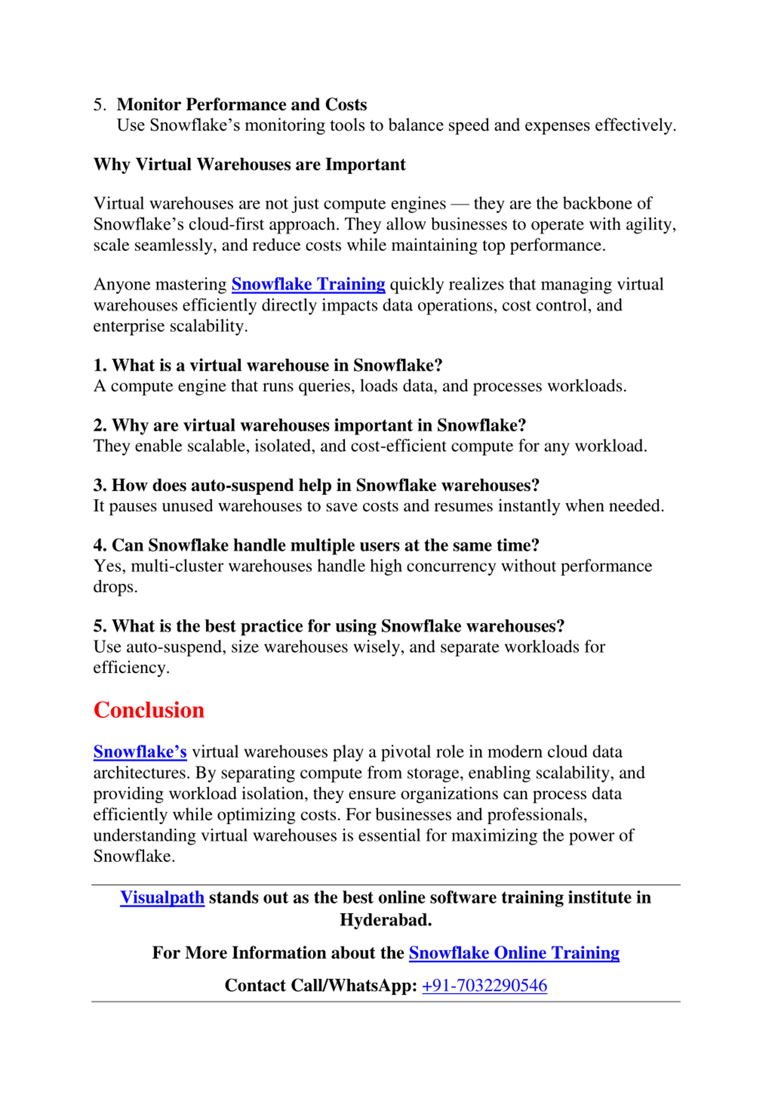 5.Monitor Performance and Costs Use Snowflake s monitoring tools to balance speed and expenses effectively. Why Virtual Warehouses are Important Virtual warehouses are not just compute engines they are the backbone of Snowflake s cloud-first approach. They allow businesses to operate with agility, scale seamlessly, and reduce costs while maintaining top performance. Anyone mastering Snowflake Training quickly realizes that managing virtual warehouses efficiently directly impacts data operations, cost control, and enterprise scalability. 1. What is a virtual warehouse in Snowflake? A compute engine that runs queries, loads data, and processes workloads. 2. Why are virtual warehouses important in Snowflake? They enable scalable, isolated, and cost-efficient compute for any workload. 3. How does auto-suspend help in Snowflake warehouses? It pauses unused warehouses to save costs and resumes instantly when needed. 4. Can Snowflake handle multiple users at the same time? Yes, multi-cluster warehouses handle high concurrency without performance drops. 5. What is the best practice for using Snowflake warehouses? Use auto-suspend, size warehouses wisely, and separate workloads for efficiency. Conclusion Snowflake s virtual warehouses play a pivotal role in modern cloud data architectures. By separating compute from storage, enabling scalability, and providing workload isolation, they ensure organizations can process data efficiently while optimizing costs. For businesses and professionals, understanding virtual warehouses is essential for maximizing the power of Snowflake. Visualpath stands out as the best online software training institute in Hyderabad. For More Information abouttheSnowflake Online Training Contact Call/WhatsApp: +91-7032290546
