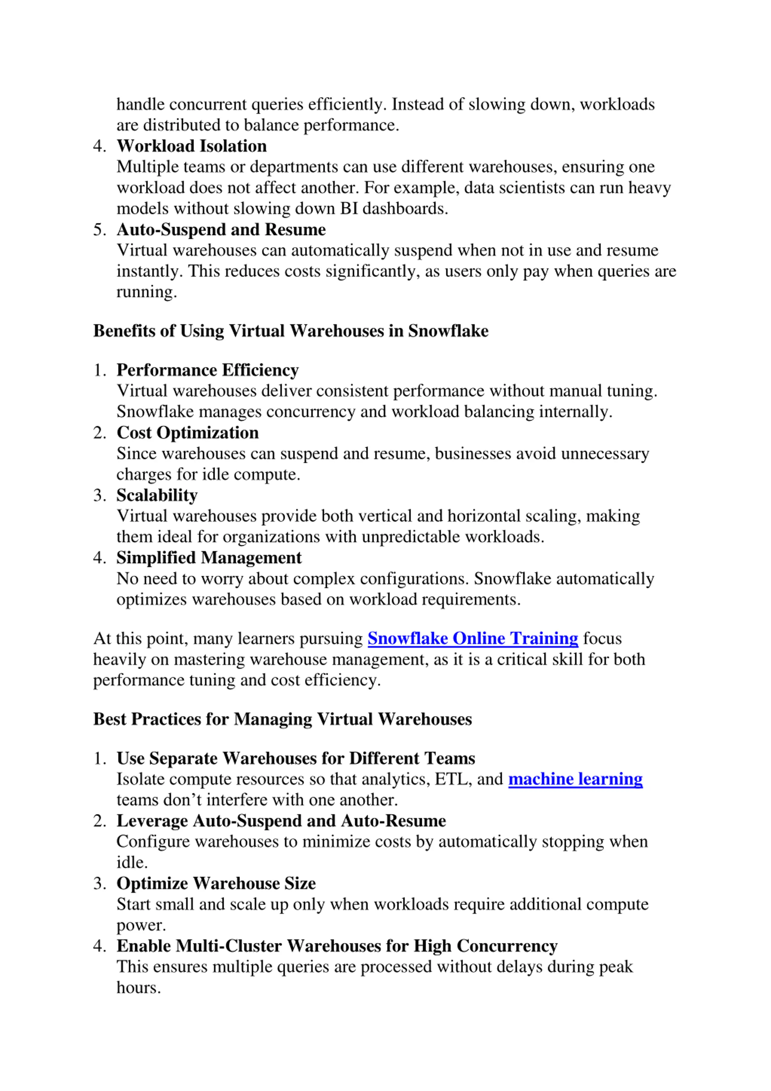 handle concurrent queries efficiently. Instead of slowing down, workloads are distributed to balance performance. 4.Workload Isolation Multiple teams or departments can use different warehouses, ensuring one workload does not affect another. For example, data scientists can run heavy models without slowing down BI dashboards. 5.Auto-Suspend and Resume Virtual warehouses can automatically suspend when not in use and resume instantly. This reduces costs significantly, as users only pay when queries are running. Benefits of Using Virtual Warehouses in Snowflake 1.Performance Efficiency Virtual warehouses deliver consistent performance without manual tuning. Snowflake manages concurrency and workload balancing internally. 2.Cost Optimization Since warehouses can suspend and resume, businesses avoid unnecessary charges for idle compute. 3.Scalability Virtual warehouses provide both vertical and horizontal scaling, making them ideal for organizations with unpredictable workloads. 4.Simplified Management No need to worry about complex configurations. Snowflake automatically optimizes warehouses based on workload requirements. At this point, many learners pursuing Snowflake Online Training focus heavily on mastering warehouse management, as it is a critical skill for both performance tuning and cost efficiency. Best Practices for Managing Virtual Warehouses 1.Use Separate Warehouses for Different Teams Isolate compute resources so that analytics, ETL, and machine learning teams don t interfere with one another. 2.Leverage Auto-Suspend and Auto-Resume Configure warehouses to minimize costs by automatically stopping when idle. 3.Optimize Warehouse Size Start small and scale up only when workloads require additional compute power. 4.Enable Multi-Cluster Warehouses for High Concurrency This ensures multiple queries are processed without delays during peak hours.