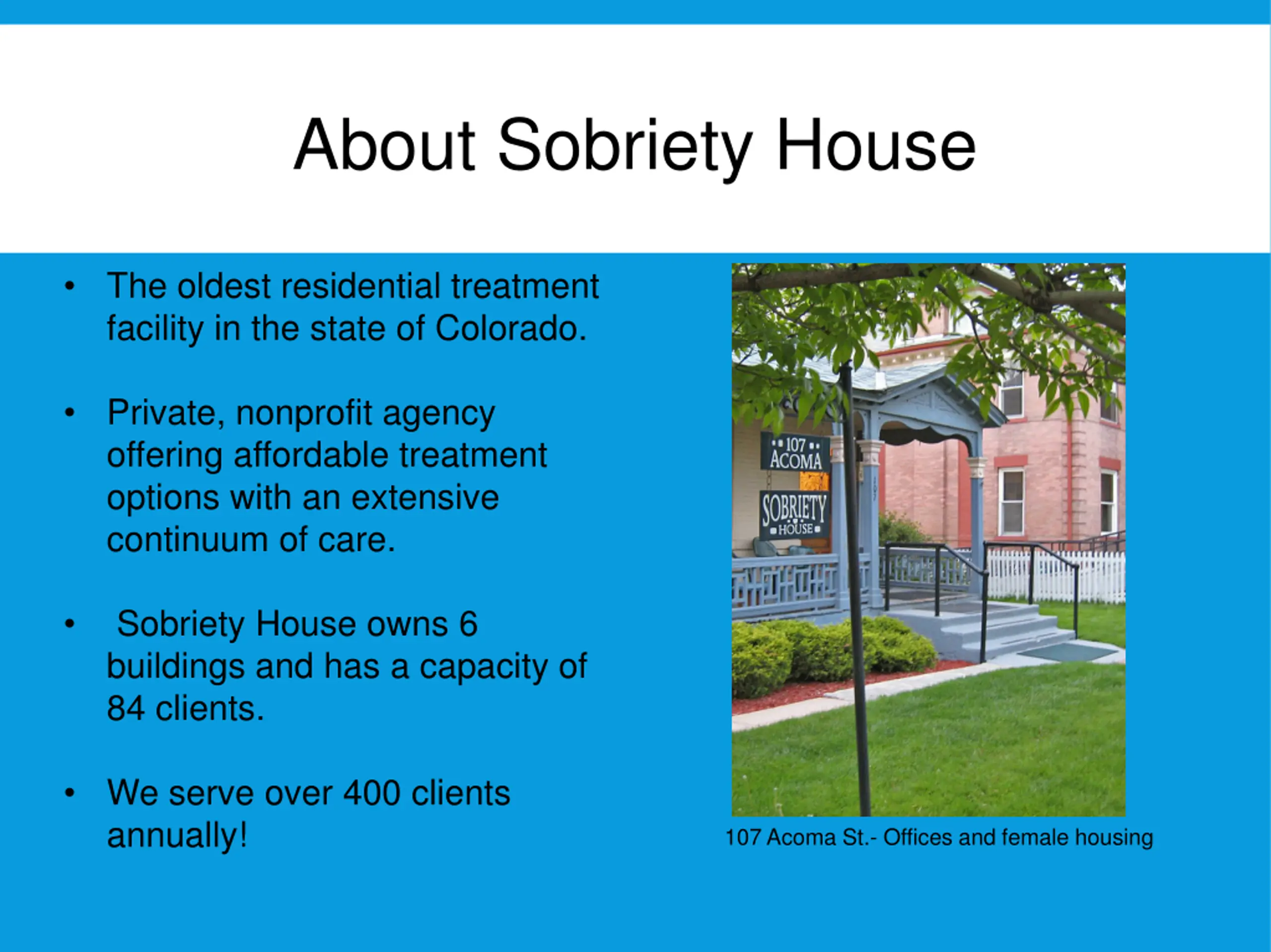 About Sobriety House The oldest residential treatment facility in the state of Colorado. Private, nonprofit agency offering affordable treatment options with an extensive continuum of care. Sobriety House owns 6 buildings and has a capacity of 84 clients. We serve over 400 clients annually! 107 Acoma St.- Offices and female housing
