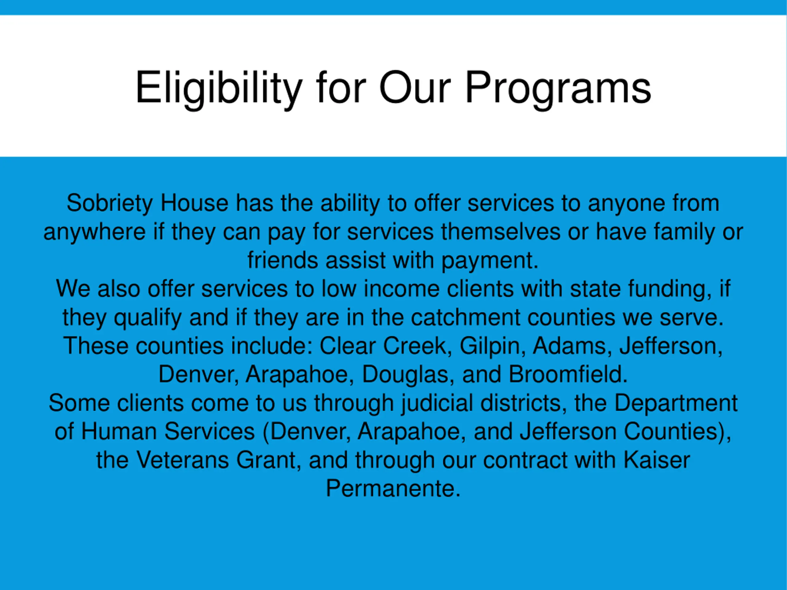 Eligibility for Our Programs Sobriety House has the ability to offer services to anyone from anywhere if they can pay for services themselves or have family or friends assist with payment. We also offer services to low income clients with state funding, if they qualify and if they are in the catchment counties we serve. These counties include: Clear Creek, Gilpin, Adams, Jefferson, Denver, Arapahoe, Douglas, and Broomfield. Some clients come to us through judicial districts, the Department of Human Services (Denver, Arapahoe, and Jefferson Counties), the Veterans Grant, and through our contract with Kaiser Permanente.