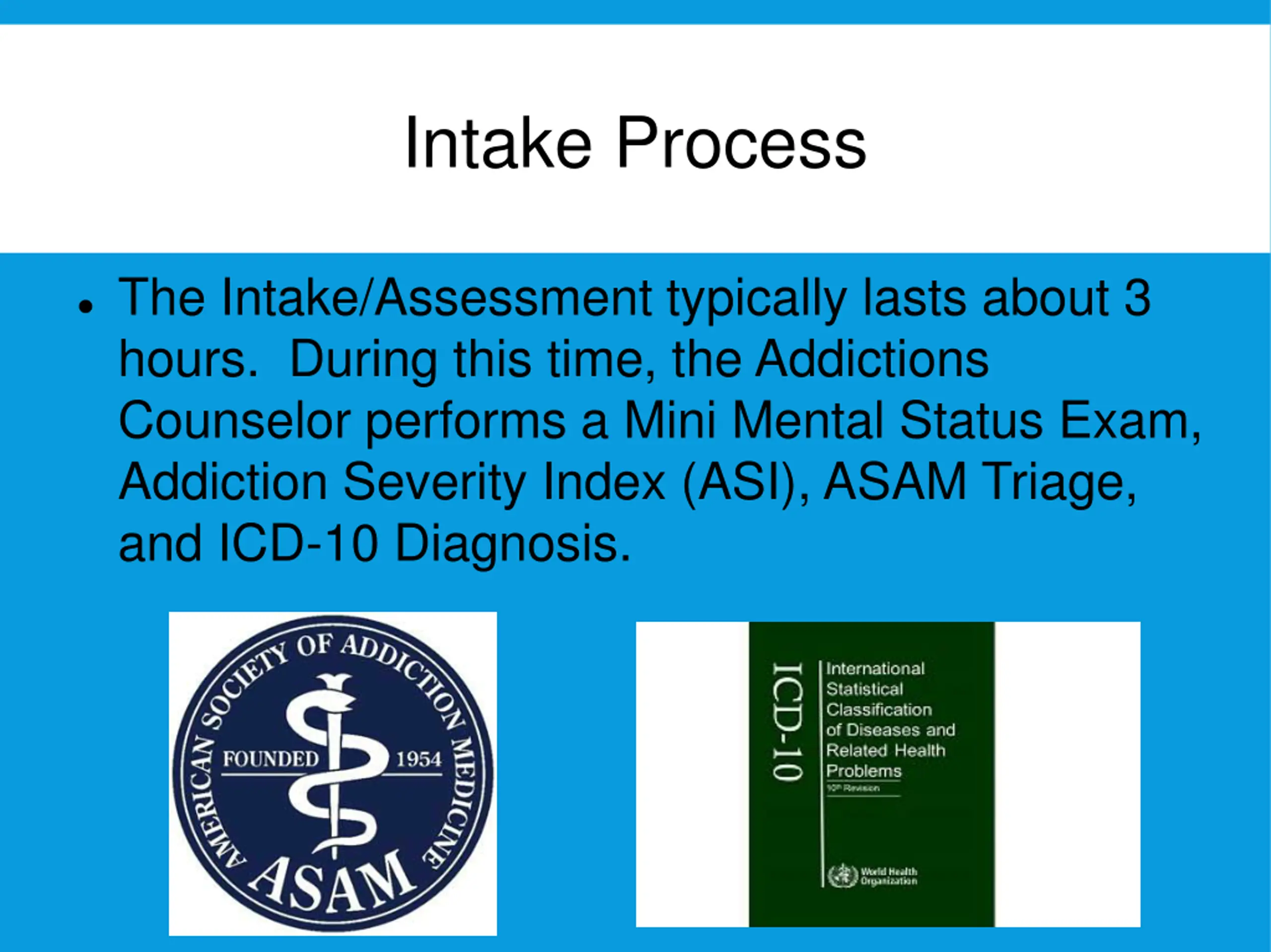 Intake Process The Intake/Assessment typically lasts about 3 hours. During this time, the Addictions Counselor performs a Mini Mental Status Exam, Addiction Severity Index (ASI), ASAM Triage, and ICD-10 Diagnosis.