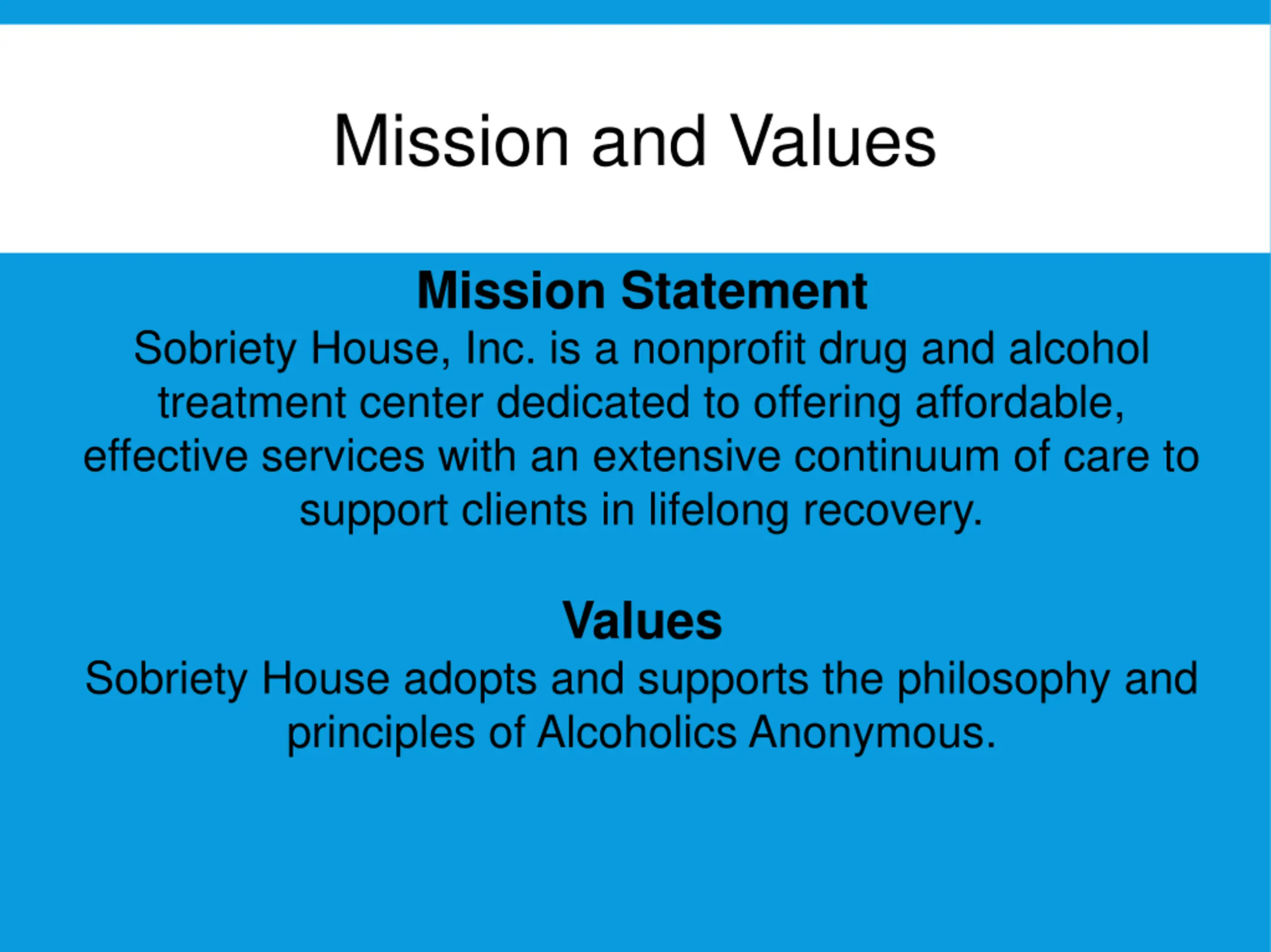 Mission and Values Mission Statement Sobriety House, Inc. is a nonprofit drug and alcohol treatment center dedicated to offering affordable, effective services with an extensive continuum of care to support clients in lifelong recovery. Values Sobriety House adopts and supports the philosophy and principles of Alcoholics Anonymous.