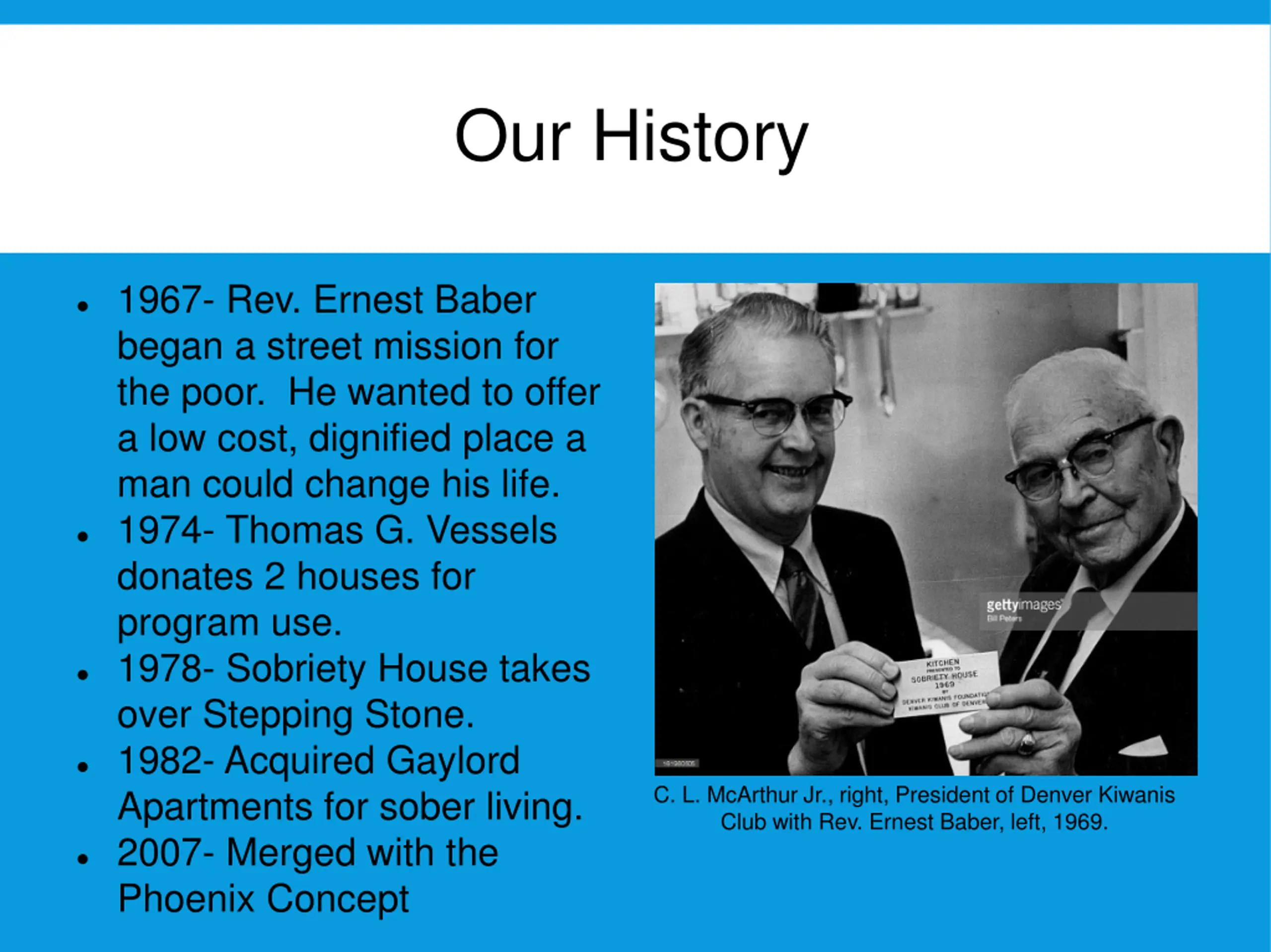 Our History 1967- Rev. Ernest Baber began a street mission for the poor. He wanted to offer a low cost, dignified place a man could change his life. 1974- Thomas G. Vessels donates 2 houses for program use. 1978- Sobriety House takes over Stepping Stone. 1982- Acquired Gaylord Apartments for sober living. 2007- Merged with the Phoenix Concept C. L. McArthur Jr., right, President of Denver Kiwanis Club with Rev. Ernest Baber, left, 1969.