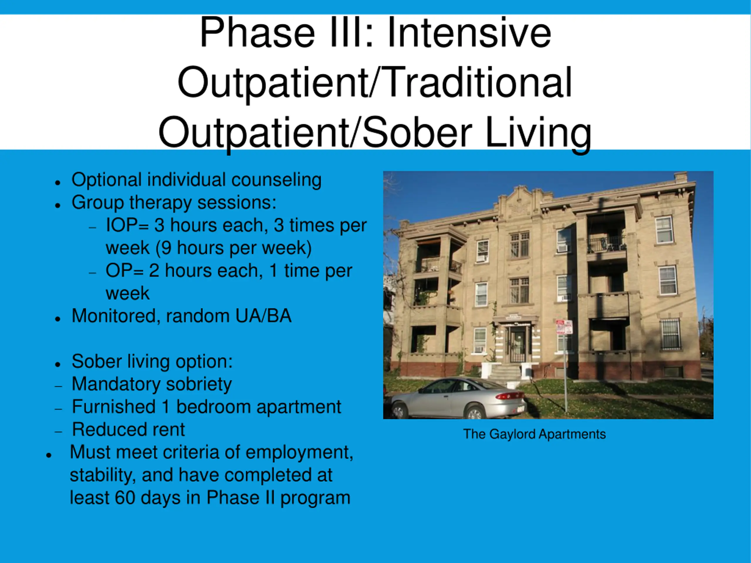Phase III: Intensive Outpatient/Traditional Outpatient/Sober Living Optional individual counseling Group therapy sessions: IOP= 3 hours each, 3 times per week (9 hours per week) OP= 2 hours each, 1 time per week Monitored, random UA/BA Sober living option: Mandatory sobriety Furnished 1 bedroom apartment Reduced rent Must meet criteria of employment, stability, and have completed at least 60 days in Phase II program The Gaylord Apartments