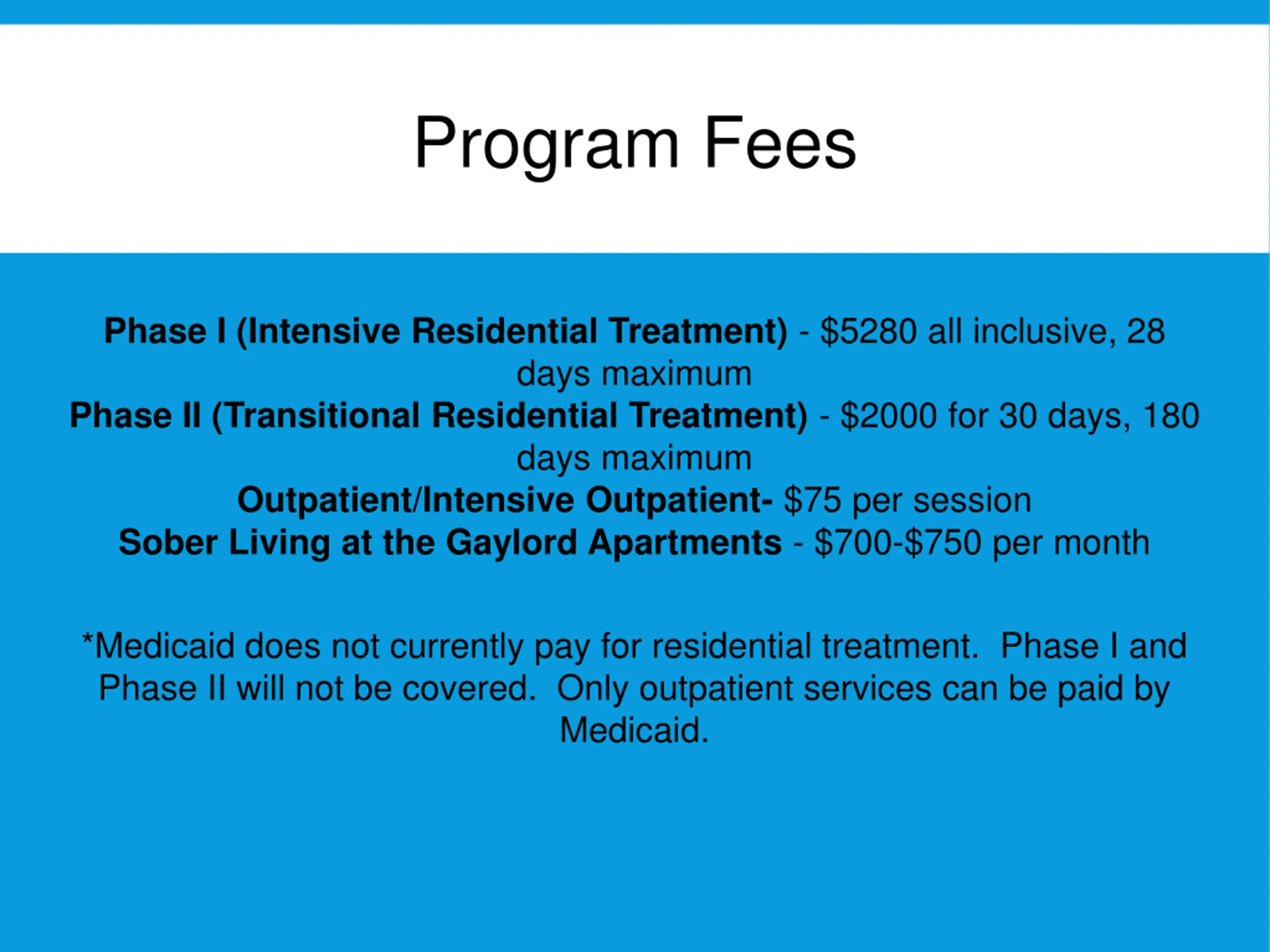 Program Fees Phase I(Intensive Residential Treatment) - $5280 all inclusive, 28 days maximum Phase II(Transitional Residential Treatment) - $2000 for 30 days, 180 days maximum Outpatient/Intensive Outpatient- $75 per session Sober Living at the Gaylord Apartments - $700-$750 per month *Medicaid does not currently pay for residential treatment. Phase I and Phase II will not be covered. Only outpatient services can be paid by Medicaid.