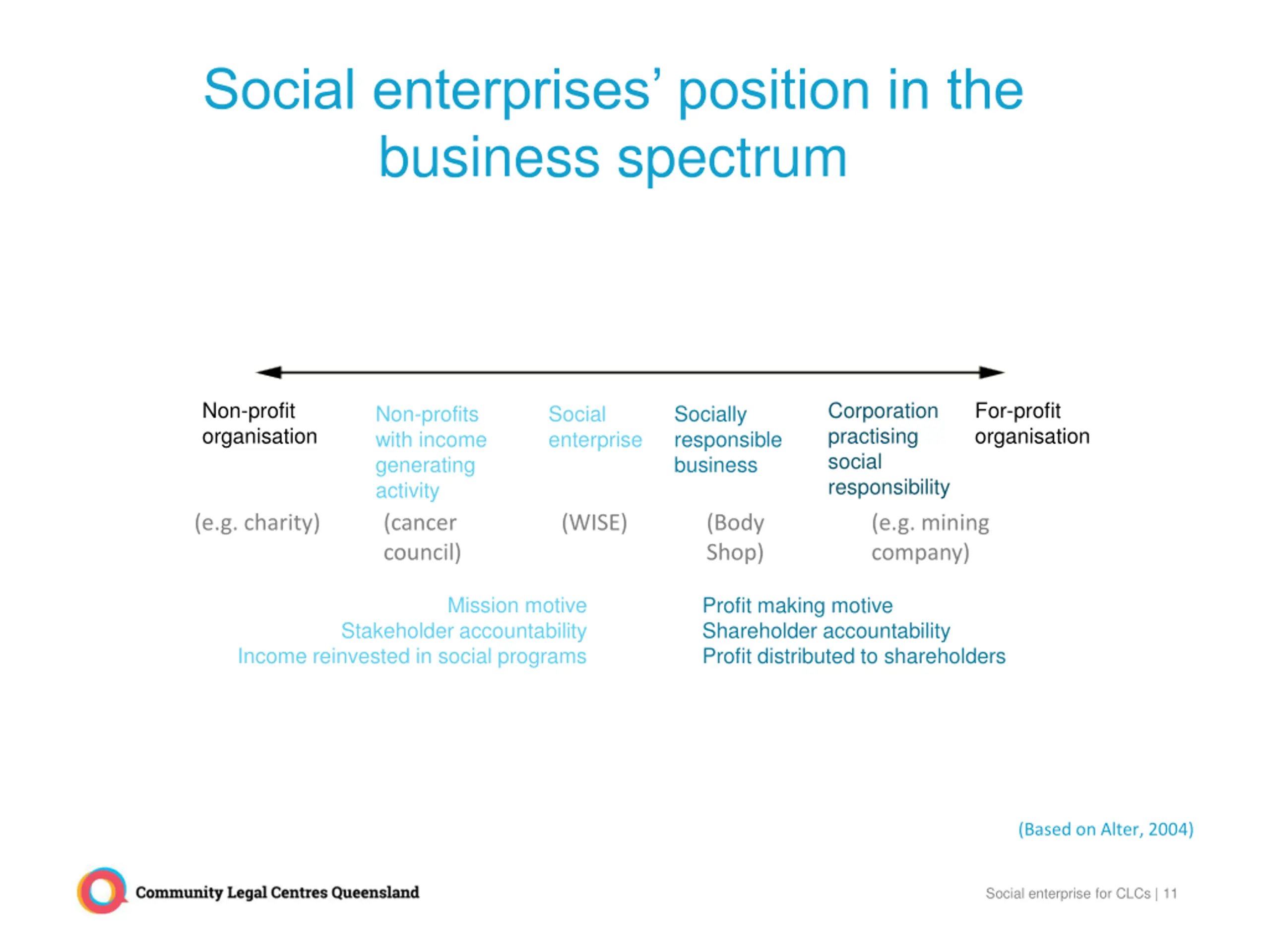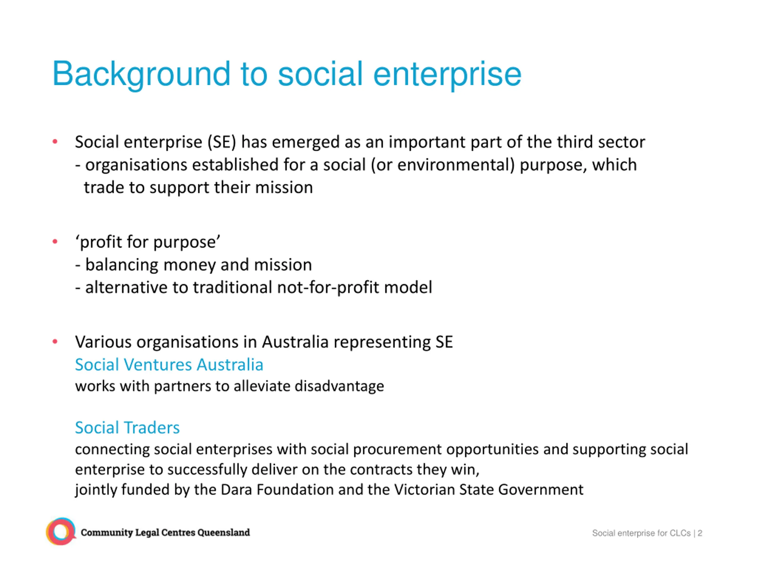 Acknowledgement of country Community Legal Centres Queensland acknowledges the traditional owners of the land on which we are holding this presentation, the Turrbul and Jaggara people. We pay our respects to their elders, past, present and emerging, and acknowledge the important role Aboriginal and Torres Strait Islanders continue to play in our society. As this presentation is being viewed throughout Queensland, we also pay respect to the traditional owners of the land throughout the country and extend a warm welcome to any First Australians listening to this presentation. Social enterprise for CLCs | 2