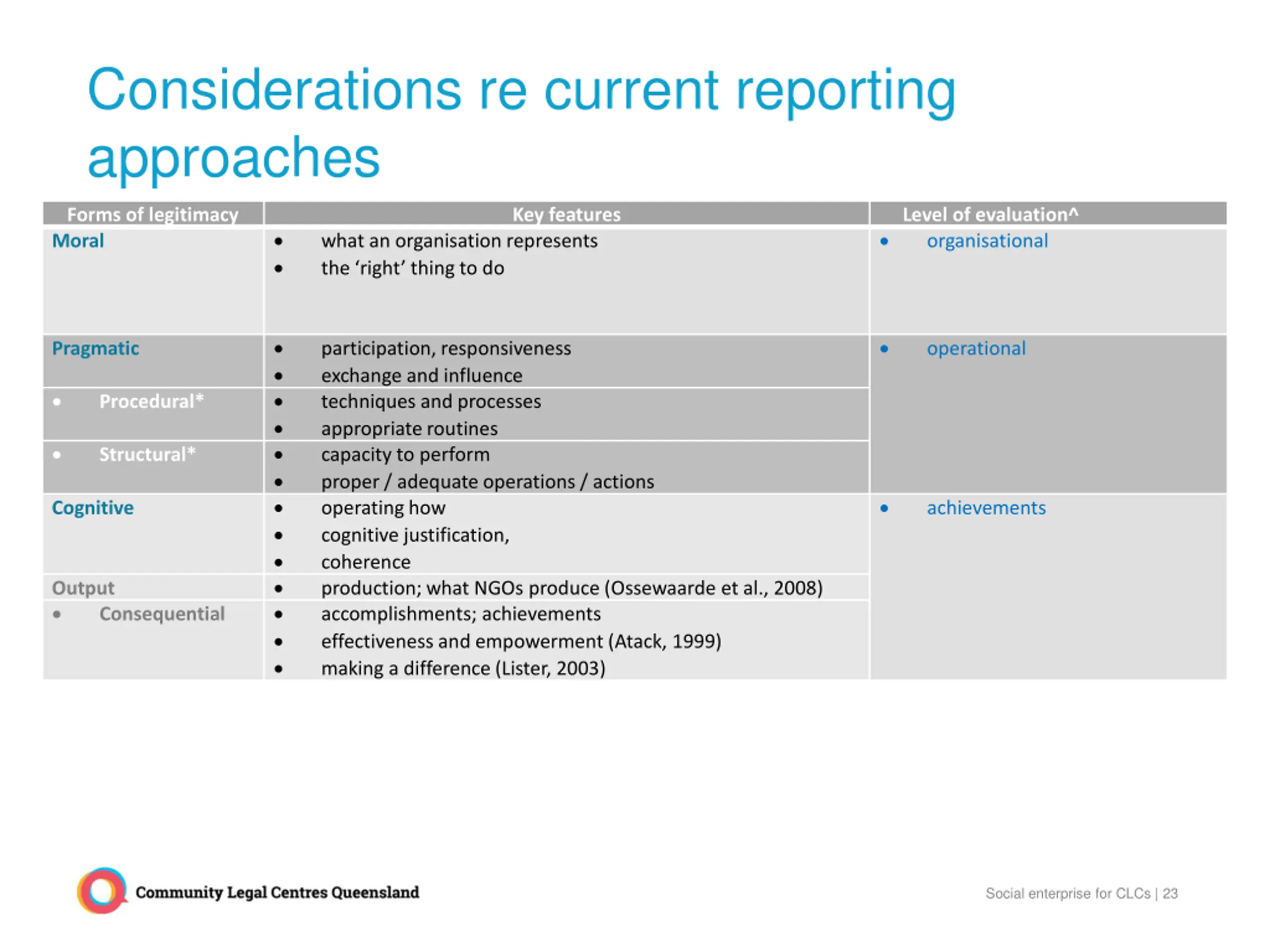 Issues re current reporting approaches Forms of legitimacy Moral Key features Level of evaluation^ Pragmatic Procedural* Structural* Cognitive Output Consequential Social enterprise for CLCs | 22