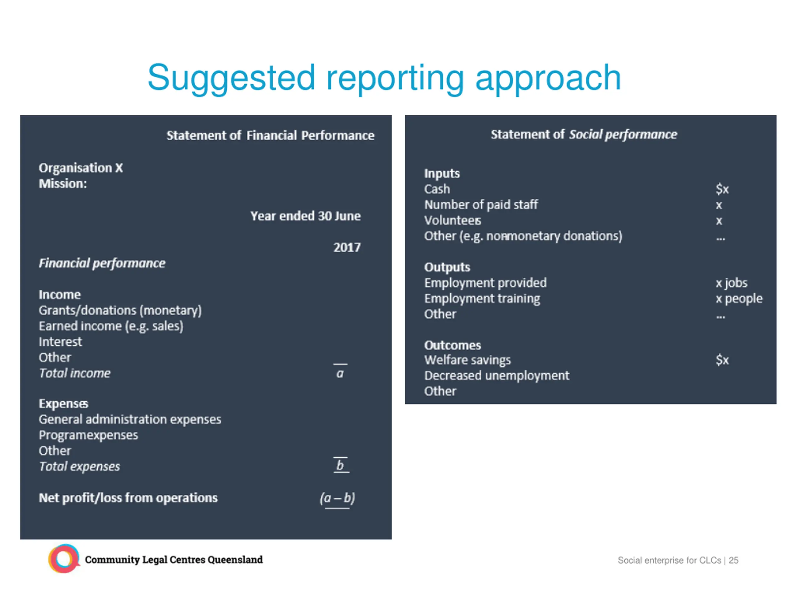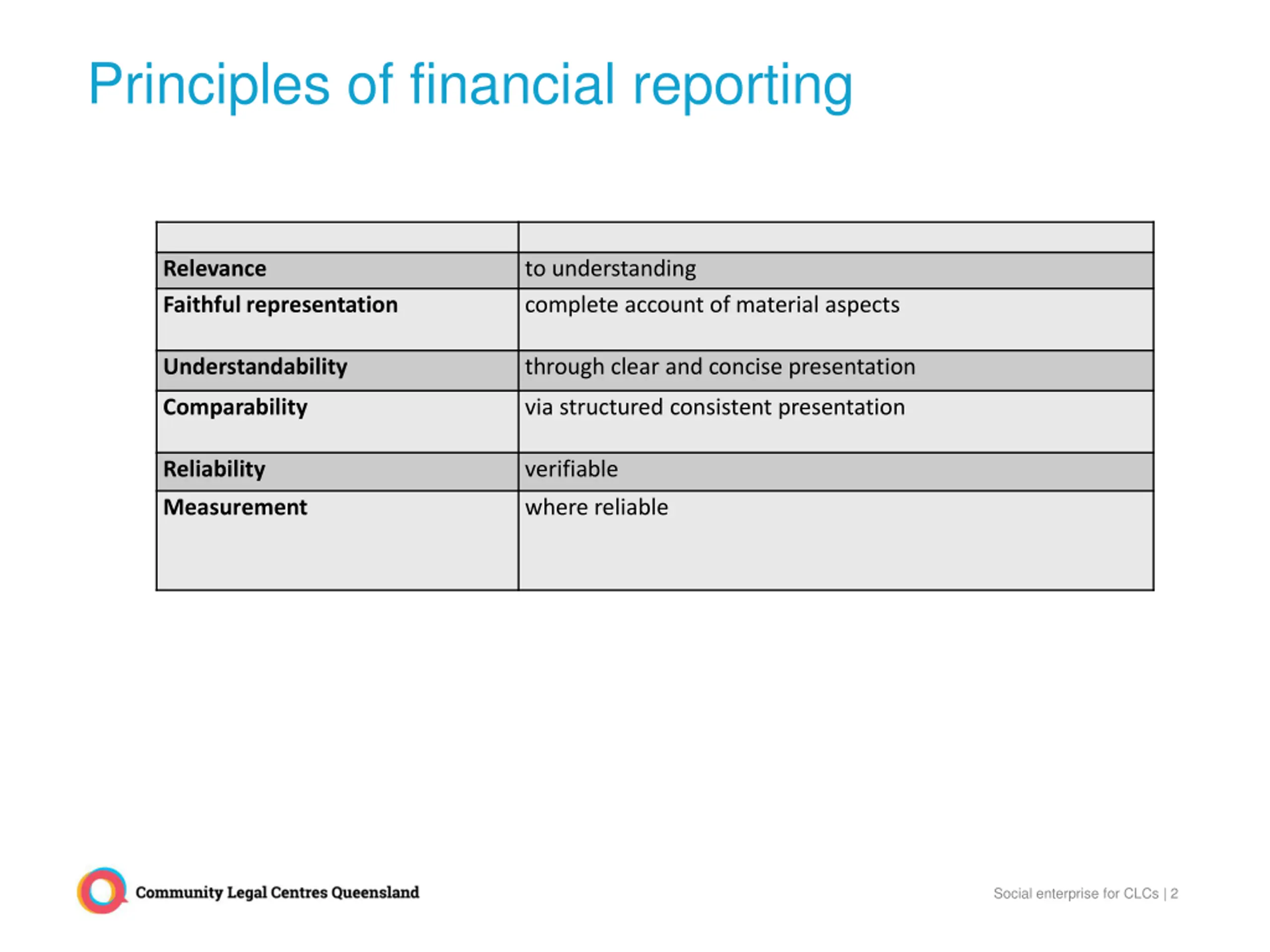 Principles of financial reporting Relevance Faithful representation to understanding complete account of material aspects Understandability through clear and concise presentation Comparability via structured consistent presentation Reliability verifiable Measurement where reliable Social enterprise for CLCs | 2