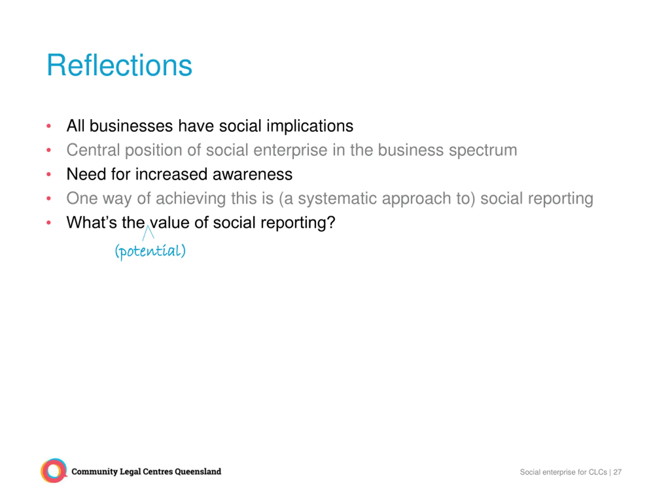 Reflections All businesses have social implications Central position of social enterprise in the business spectrum Need for increased awareness One way of achieving this is (a systematic approach to) social reporting What s the value of social reporting? (potential) (potential) Social enterprise for CLCs | 27