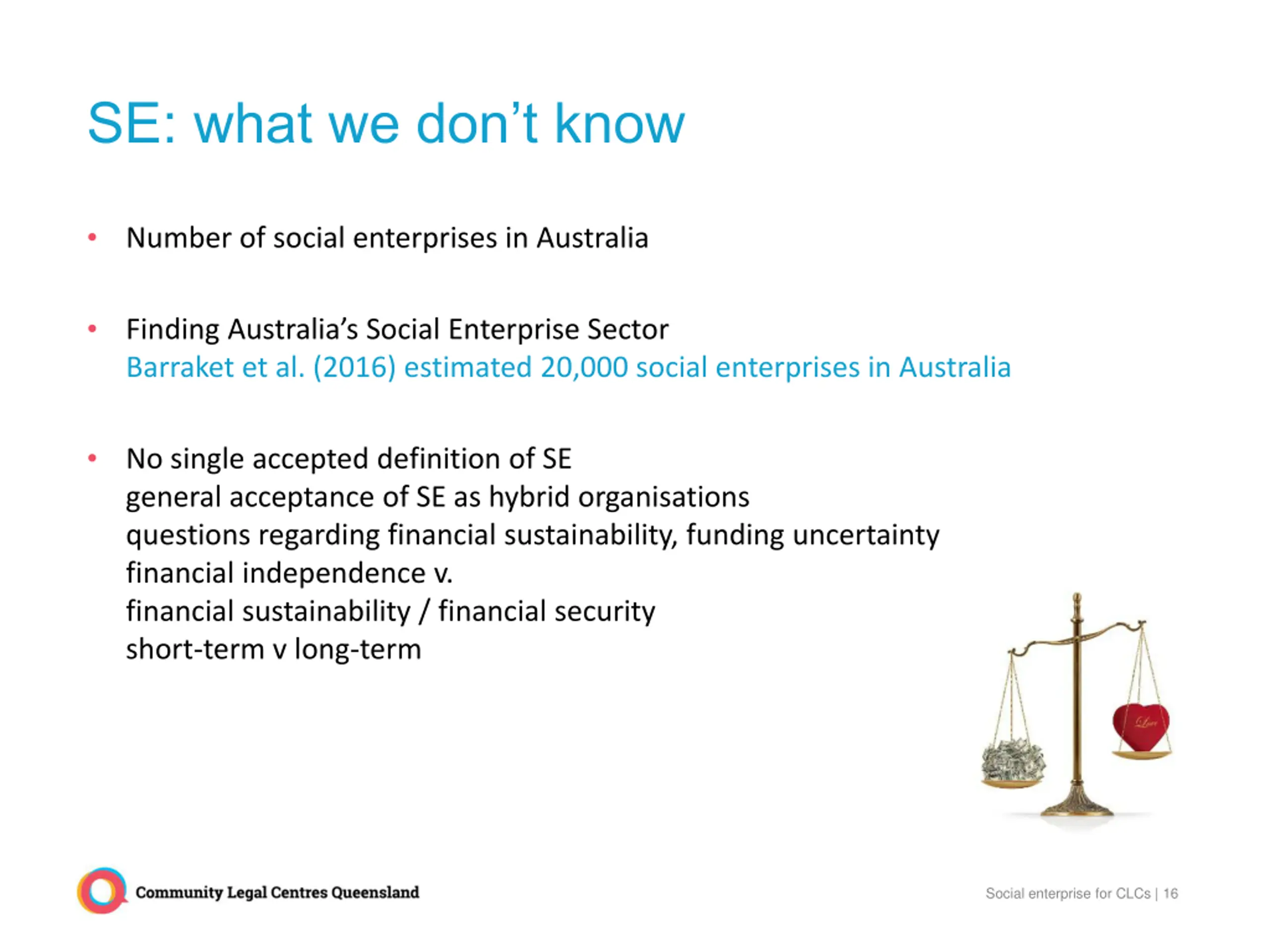 SE: what we dont know Number of social enterprises in Australia Finding Australia s Social Enterprise Sector Barraket et al. (2016) estimated 20,000 social enterprises in Australia No single accepted definition of SE general acceptance of SE as hybrid organisations questions regarding financial sustainability, funding uncertainty financial independence v. financial sustainability / financial security short-term v long-term Social enterprise for CLCs | 16
