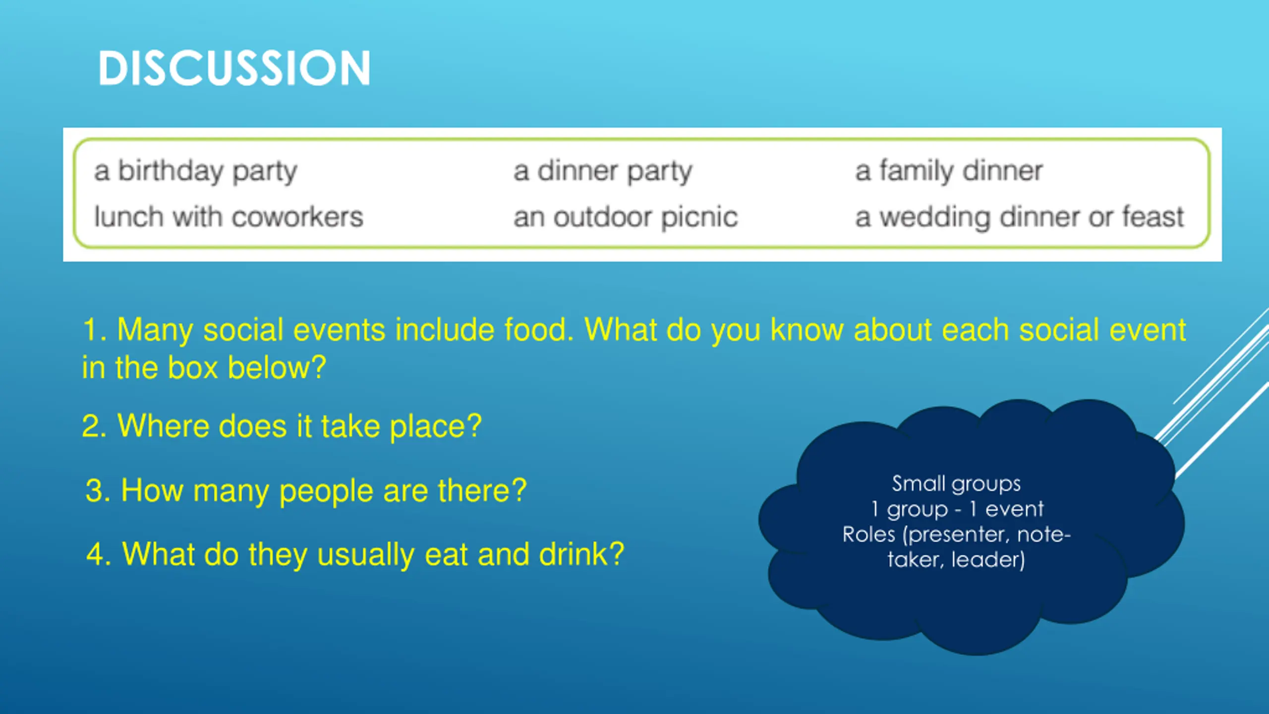DISCUSSION 1. Many social events include food. What do you know about each social event in the box below? 2. Where does it take place? 3. How many people are there? Small groups 1 group - 1 event Roles (presenter, note- taker, leader) 4. What do they usually eat and drink?